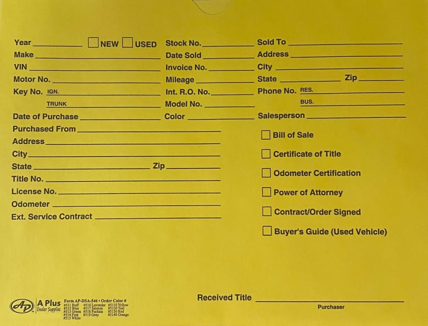 Details: Quality 32# Dealer Jackets for New or Used Vehicle Sale. 12" x 9" with convenient thumb cut along top (long) side of jacket for easy access to papers. Front side is preprinted in black ink as shown. Back side is blank. Color of jacket is yellow.
