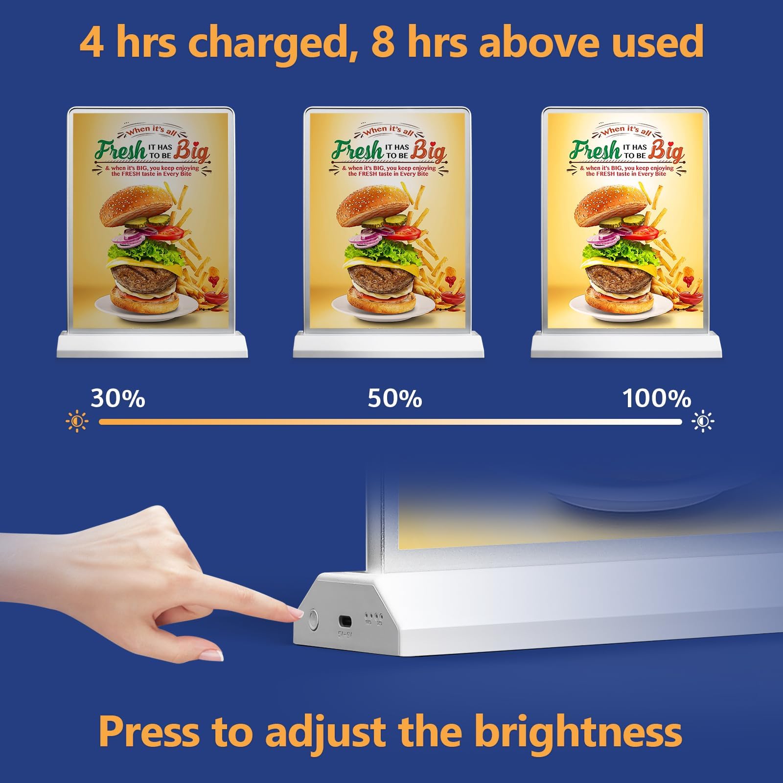 - [High-brightness & Long lighting time] After fully charged, the LED sign holder continue lighting for 8-9 hours. It can also be continuously illuminated while charging. There are 3 brightness and breath light mode, you can adjust as needed. Your pictures will attract attention effectively when illuminated by led