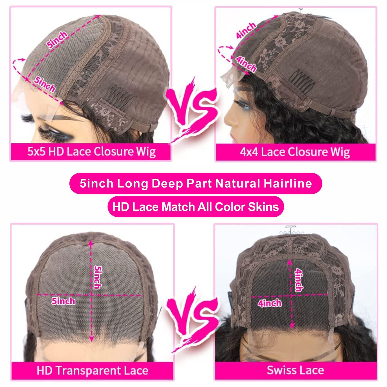 - 2、5x5 Lace Wigs Body Wave Advantage: 5x5 Hd Lace Closure Human Hair Wigs Is Easy To Install,Save Time ,5x5 Inch Lace Area Can Do More A More Area Side Part,Parting Space In Front. Free Parting, Can Make Deep Part , Made Middle or Side Part,Multiple Choice