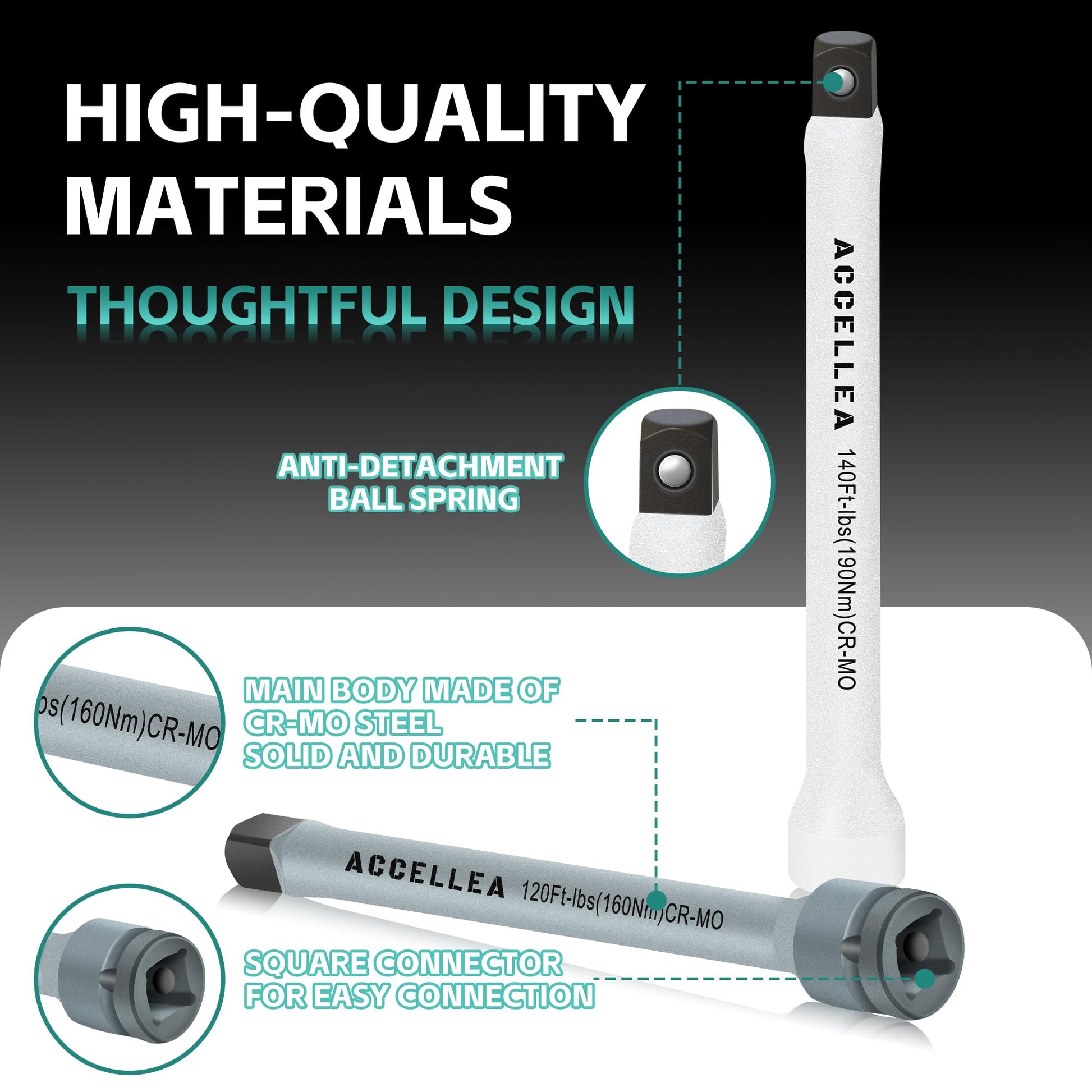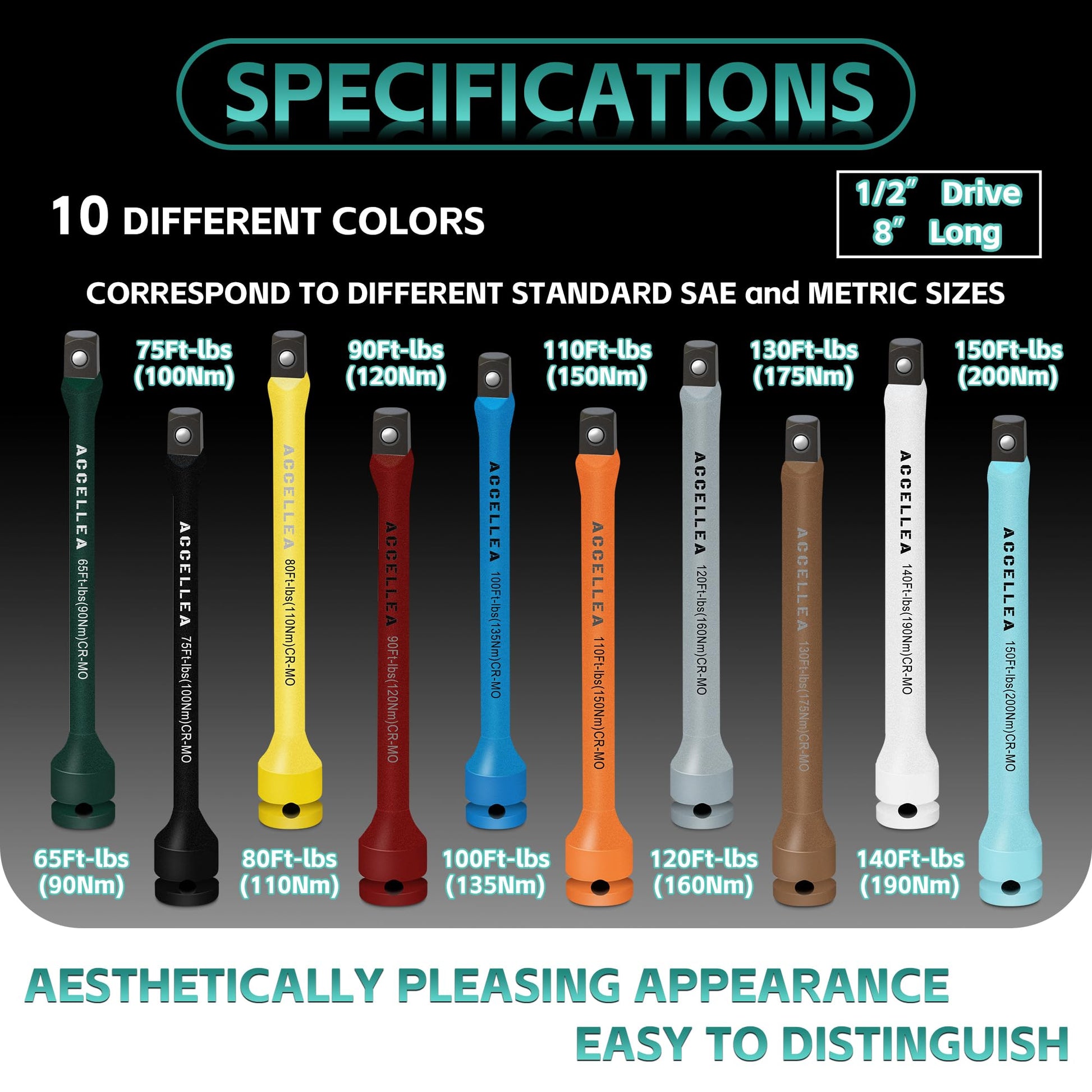 ACCELLEA 10-Piece Torque Limiting Extension Bar Set, 1/2" Drive, 8" Long, 65-150 Ft-lbs, CR-MO, SAE Standard, Color-Coded Impact Socket Extension Bar Set with Storage Case, for Tire Repair & Drills
