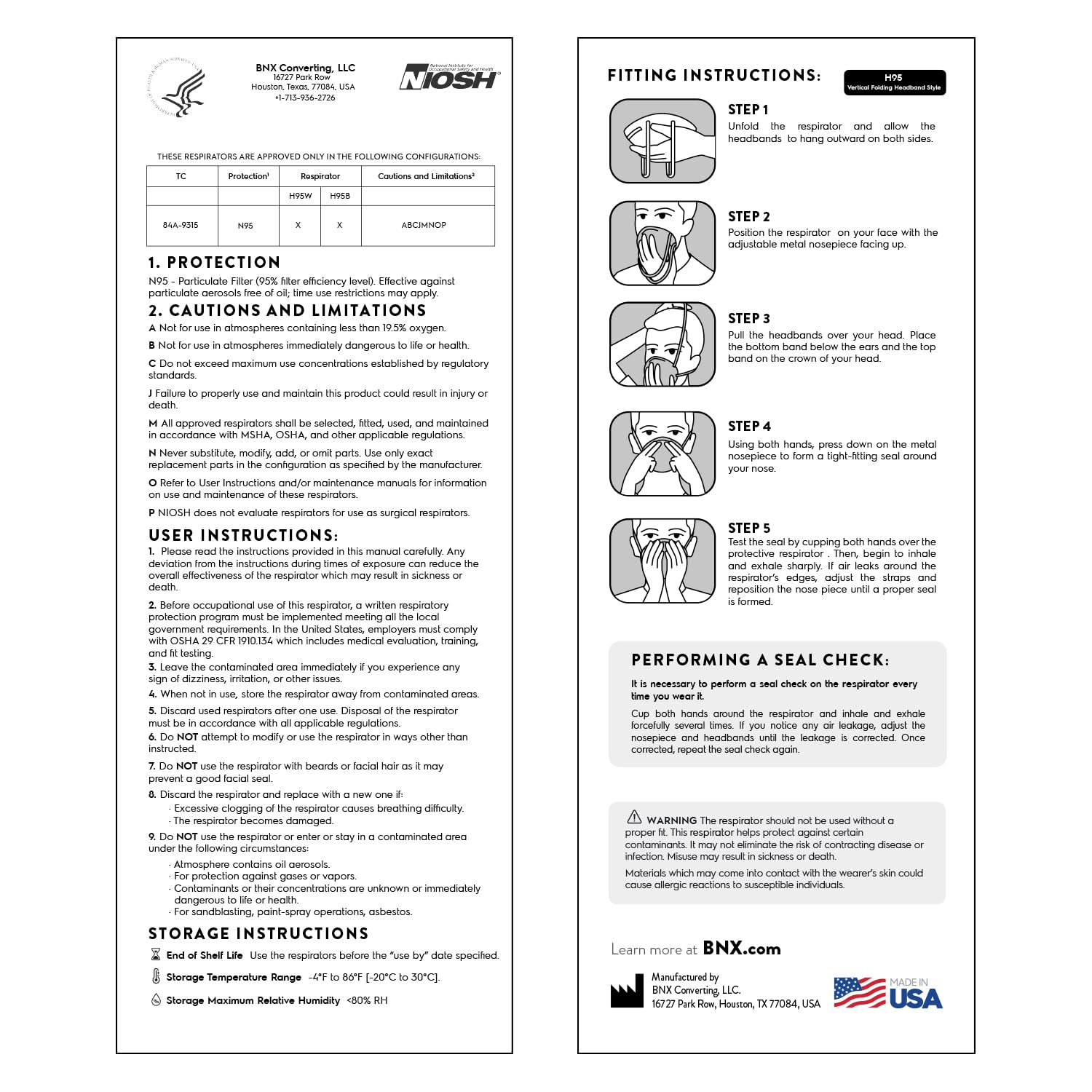- MADE IN USA – Manufactured by BNX Converting LLC in Houston TX, a NIOSH/CDC Approved and FDA Registered (Registration # 3017489417) manufacturer of N95 mask respirators.