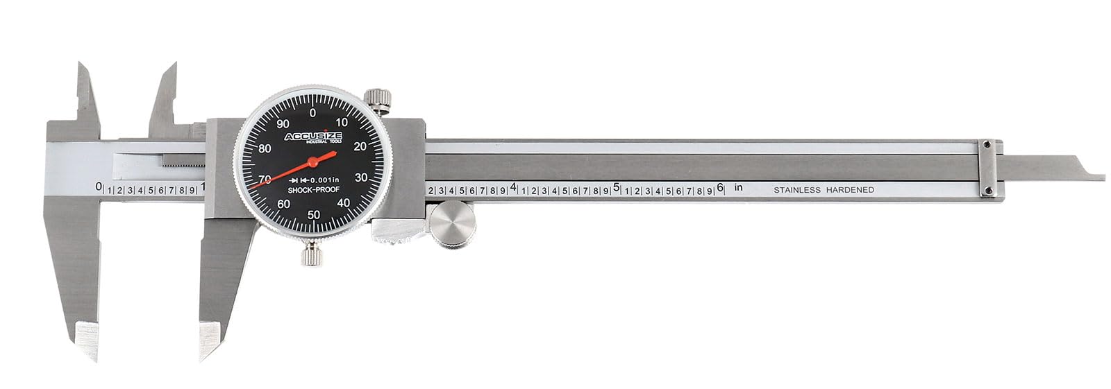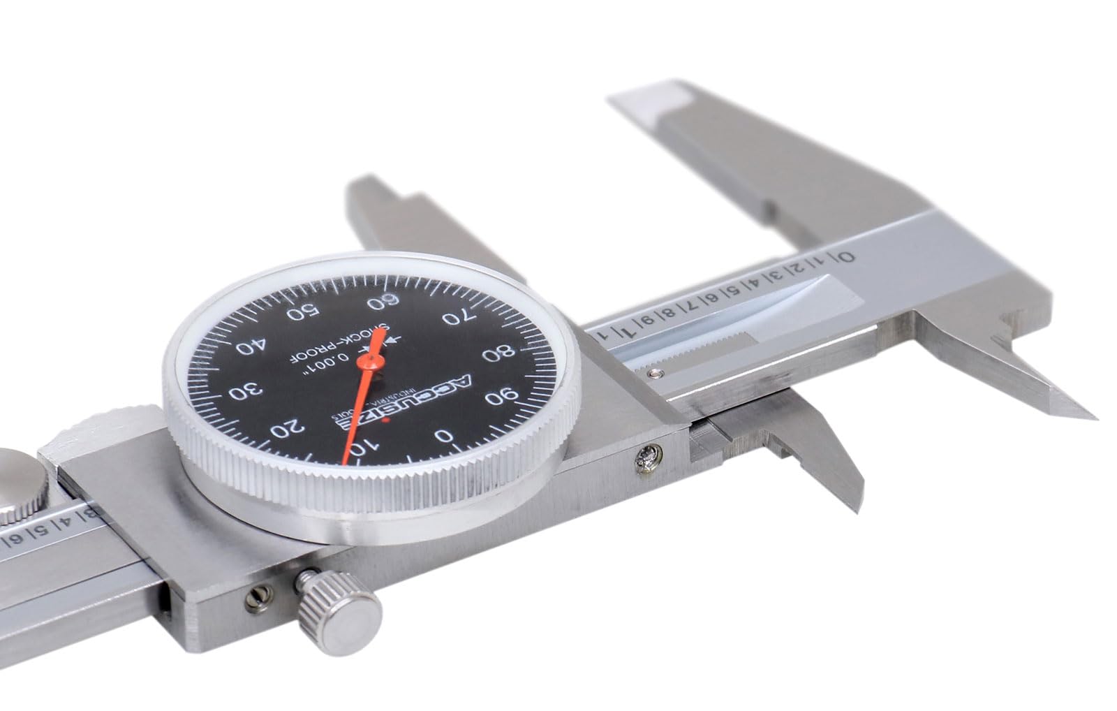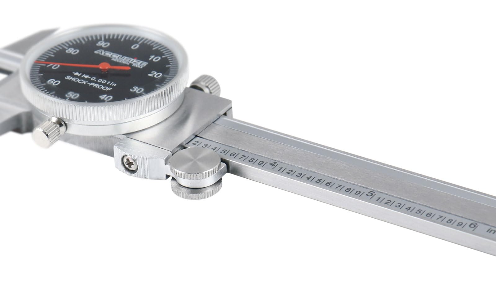 Accusize Industrial Tools 0-6" x 0.001" (Range x Resolution) Dial Caliper, Black Face Red Needle, Stainless Steel in Fitted Box, P920-B216