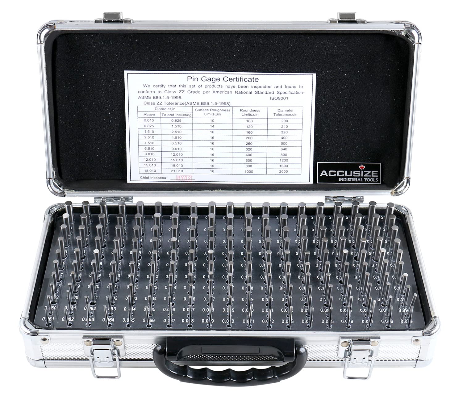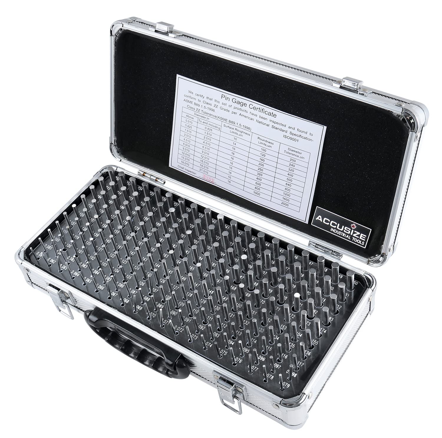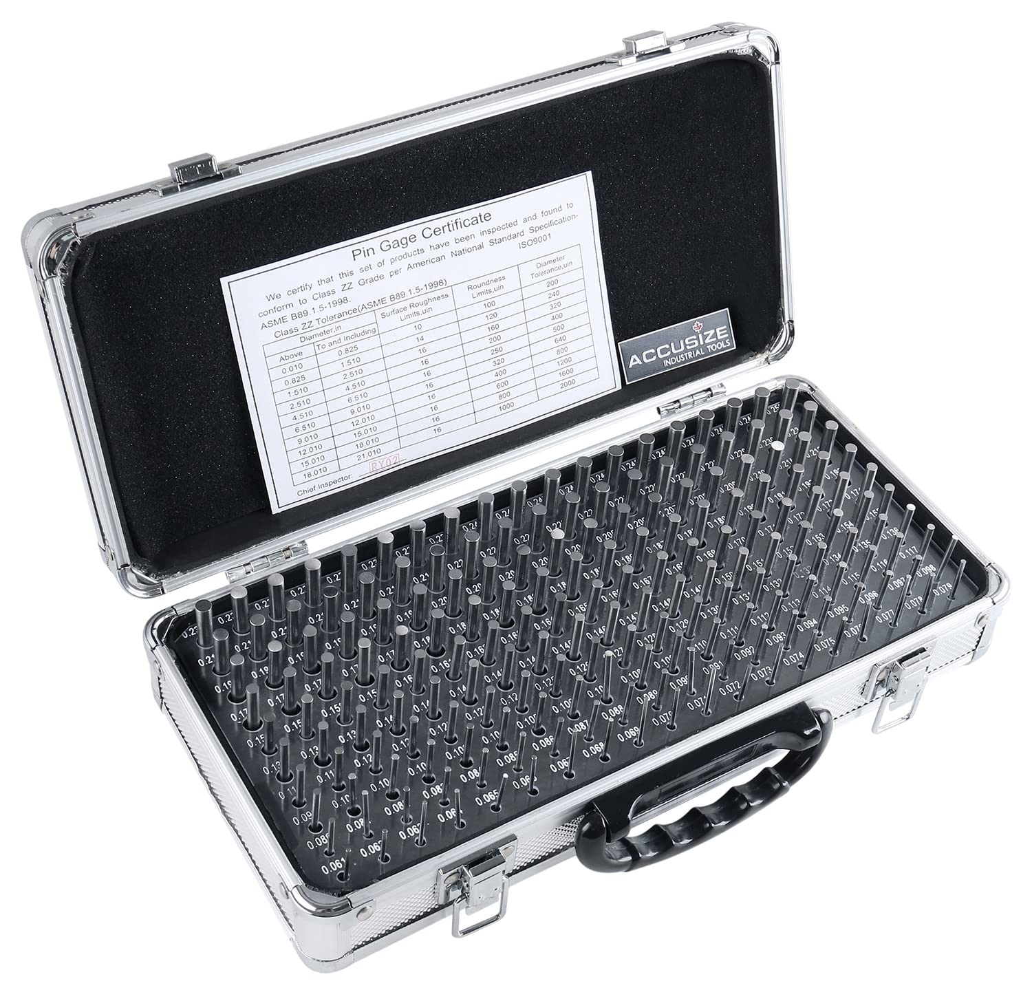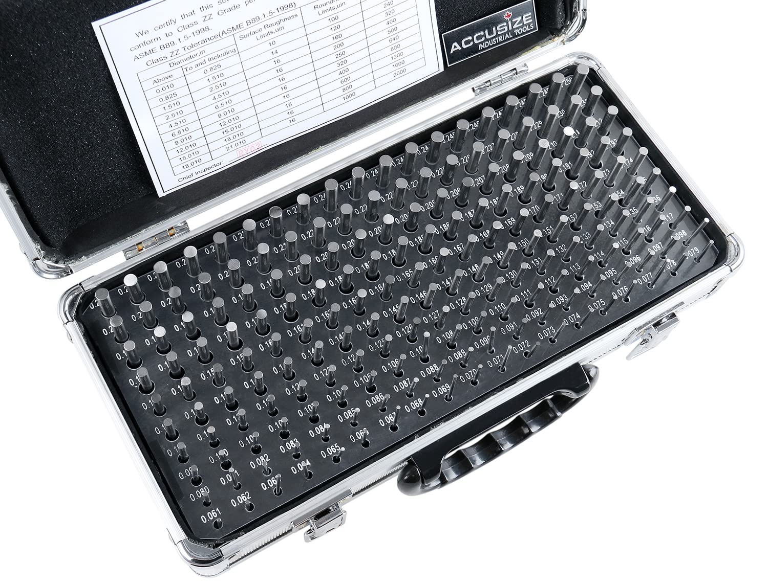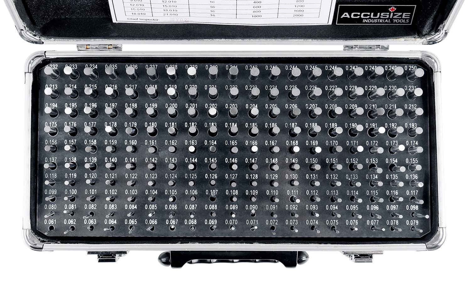 Accusize Industrial Tools - 190 Pc Precision Minus Class ZZ Pin Gauge Set, 0.061" to 0.250", 2" Length, Heat Treated, 60-62 RC, with Aluminum Case, M1(-) A