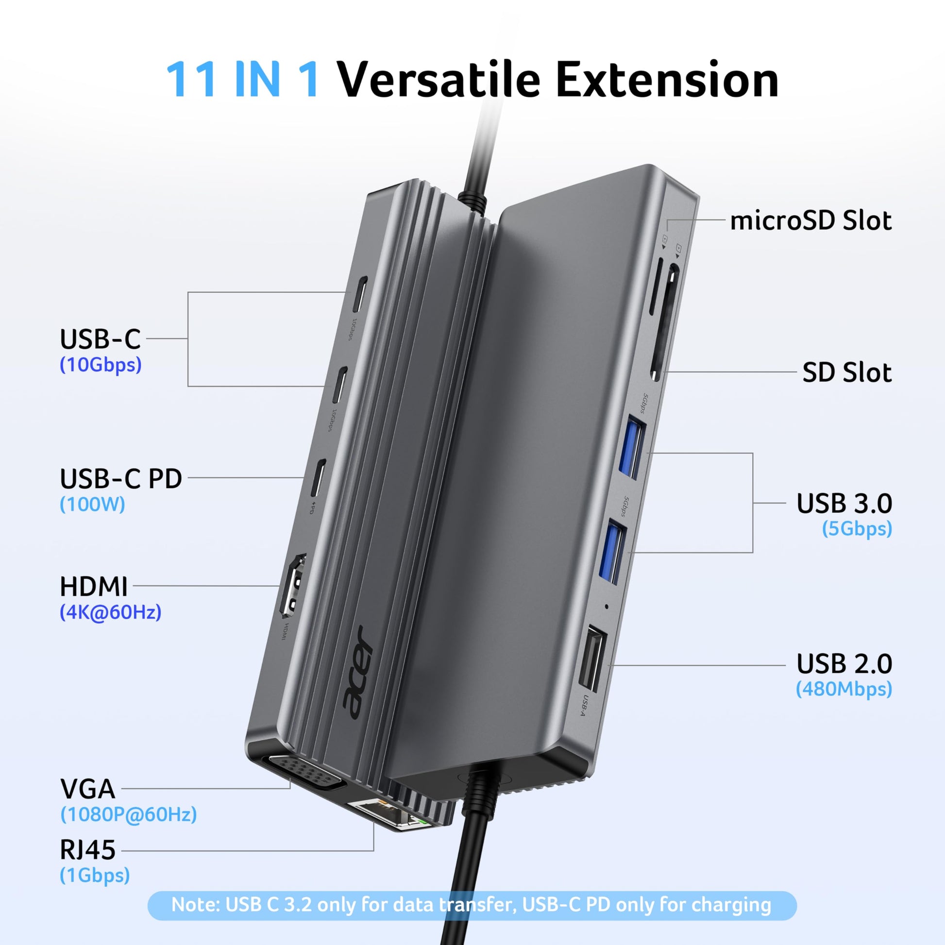 Acer 11 in 1 USB C HUB Multiport Adapter with 4K@60Hz HDMI, 1080P VGA, 2x10Gbps USB C, 2x5Gbps USB A, 100W PD Port, 1000Mbps Ethernet, SD/TF, Dual Monitor Docking Station for PC, Laptop, Desktop