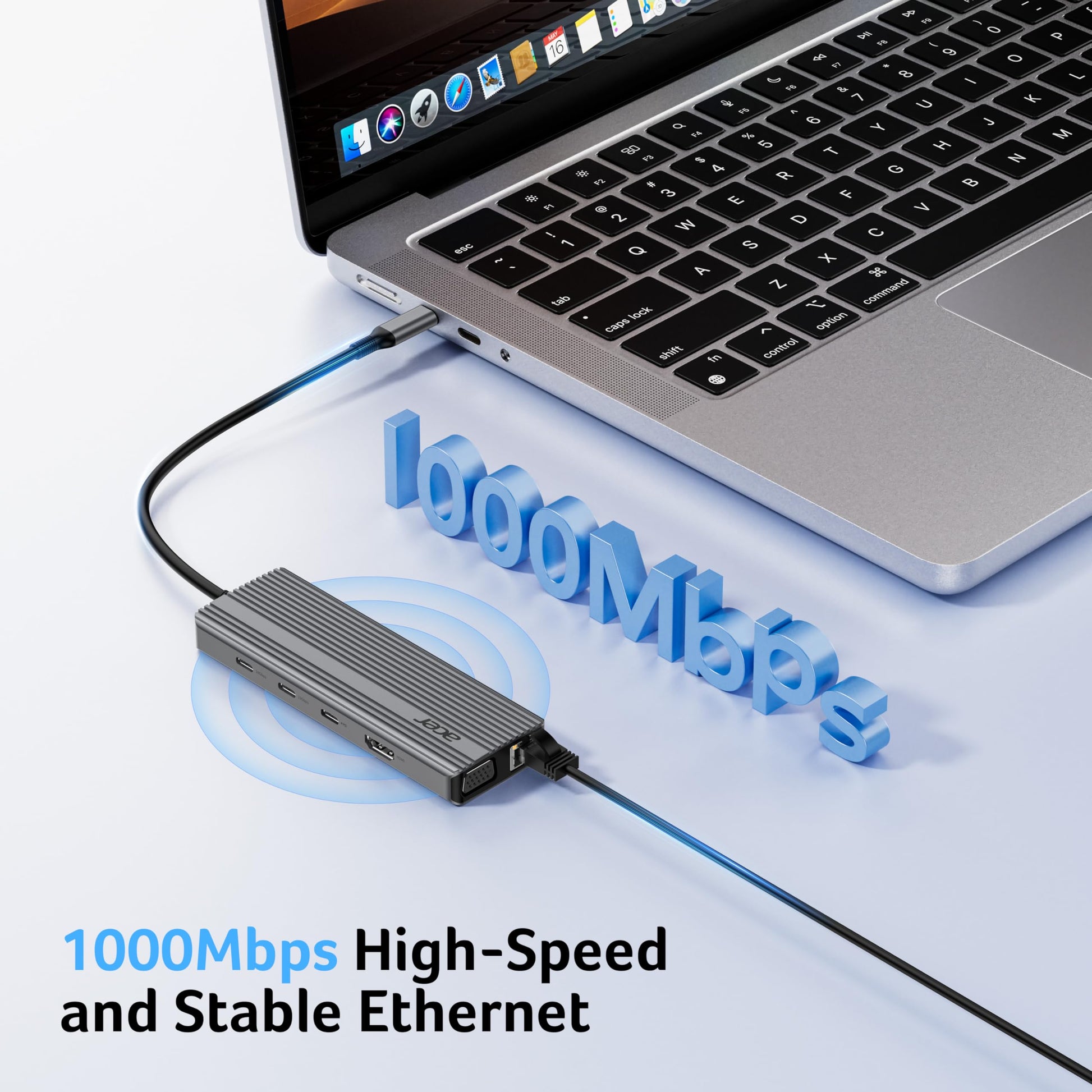 - 【11-in-1 Versatile USB C Adapter】Boost productivity with this USB C 3.2 hub, featuring 4K@60Hz HDMI, 1080P VGA, 2x USB-C (10Gbps), 2x USB-A (5Gbps), USB 2.0, 100W PD charging, 1Gbps ethernet and SD/Micro SD slots (104Mbps). This USBC hub perfect for work from home, office or travel. 📌Note: Please connect the power supply with the PD port to provide sufficient power for the USB C hub.