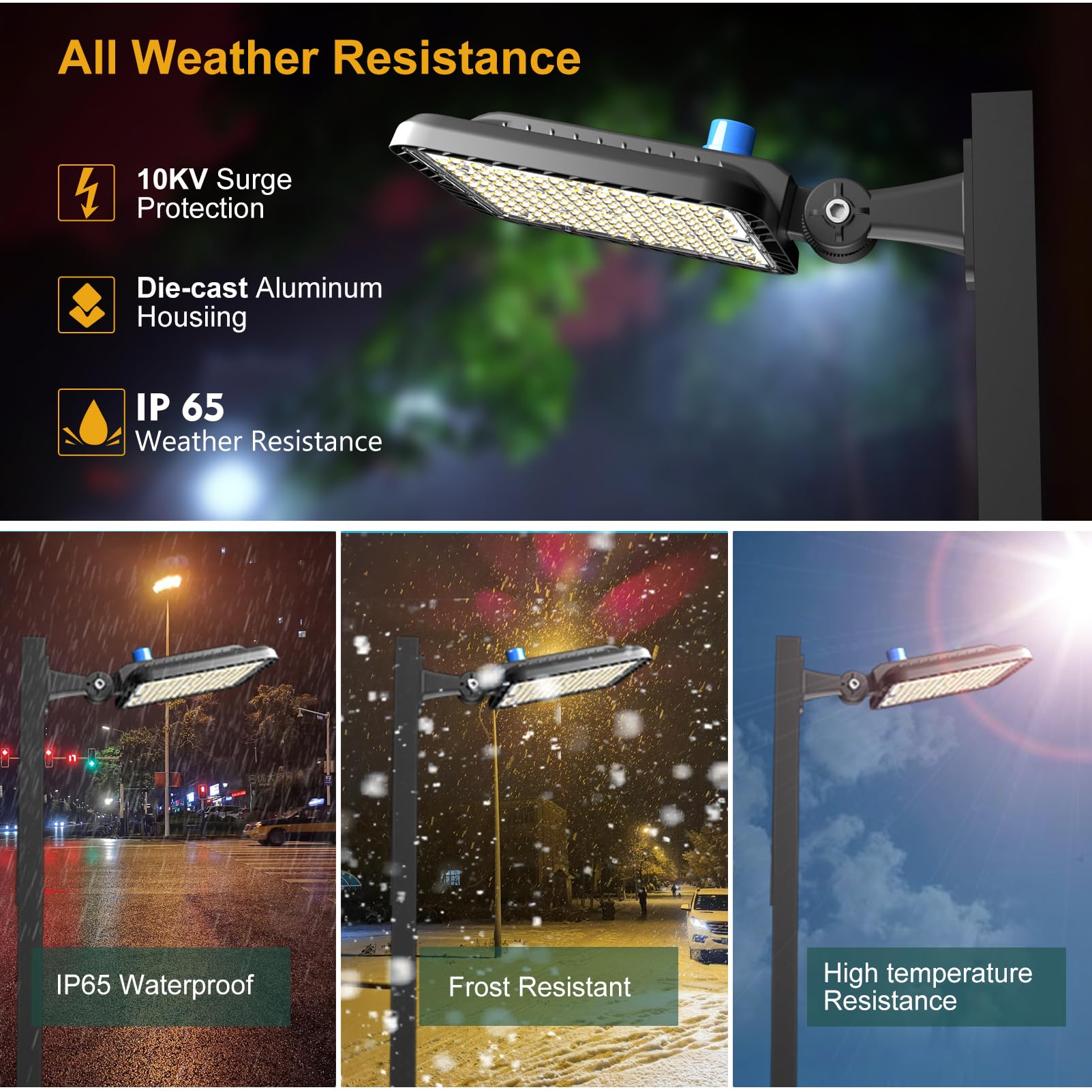- 【Military-Grade Protection & All-Weather Durability】Led Street area lights are made of die-casting aluminum body with polyester powder-coated finish, 100-277V AC professional LED driver, IP65 waterproof & 6KV surge protection. Stable performance from -40°C to 60°C like storms, snow, coastal areas. Lifespan up to 50,000 hours.