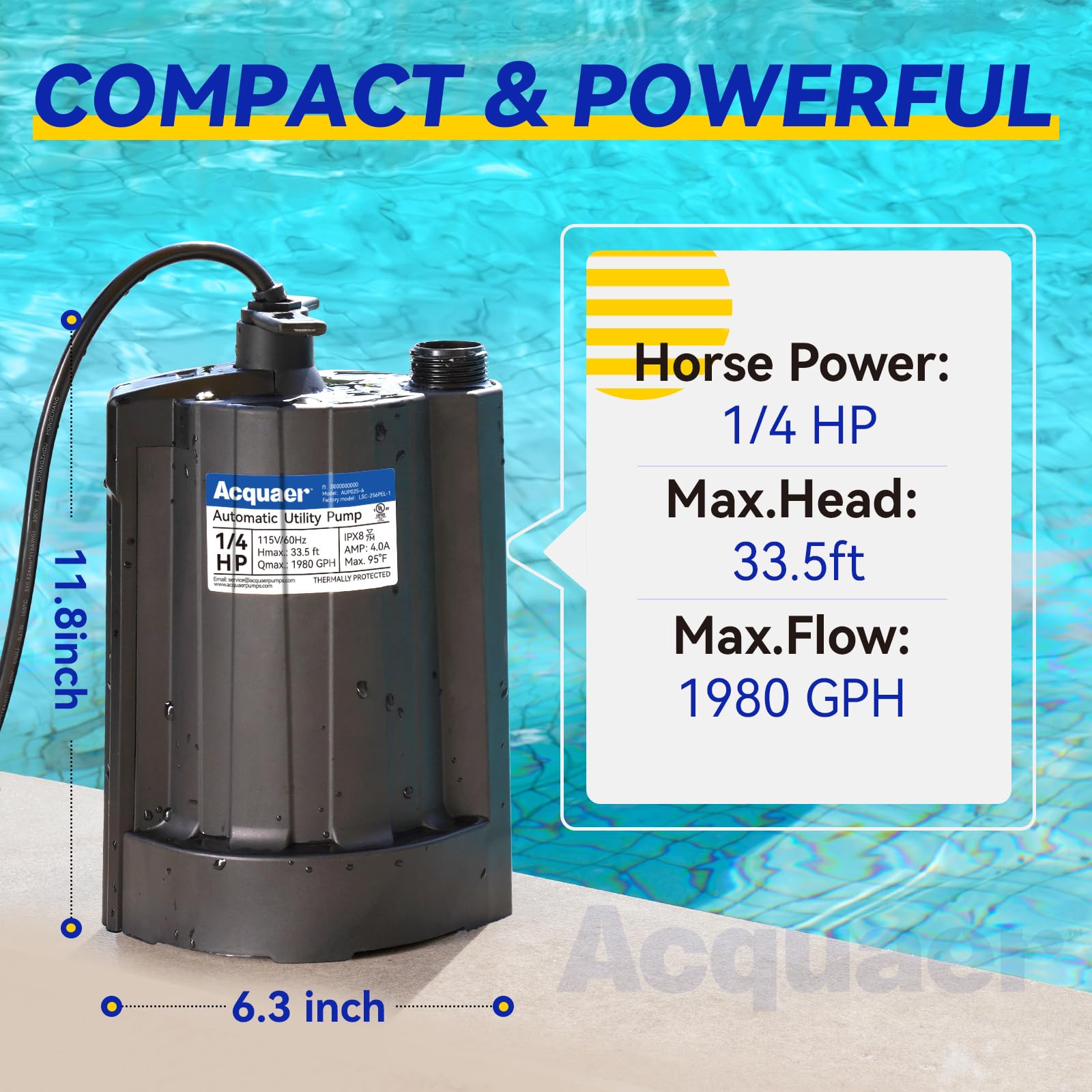 Acquaer 1/4 HP Automatic Sump Pump, 115V Submersible Water Pump with 3/4” Garden Hose Check Valve Adapter,1980 GPH High Flow Water Removal for Swimming Pool Cover Hot Tubs Flooded House Basement