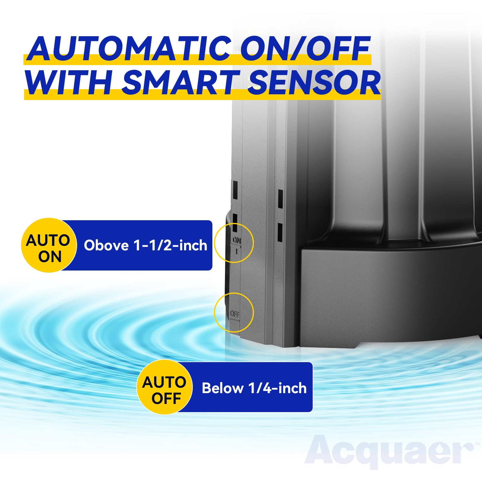 - 【AUTOMATIC ON/OFF】Built-in smart electronic sensor, Acquaer automatic submersible water pump will automatically turns on when 1-1/2'' water is detected; turns off when water level falls below 1/4''.