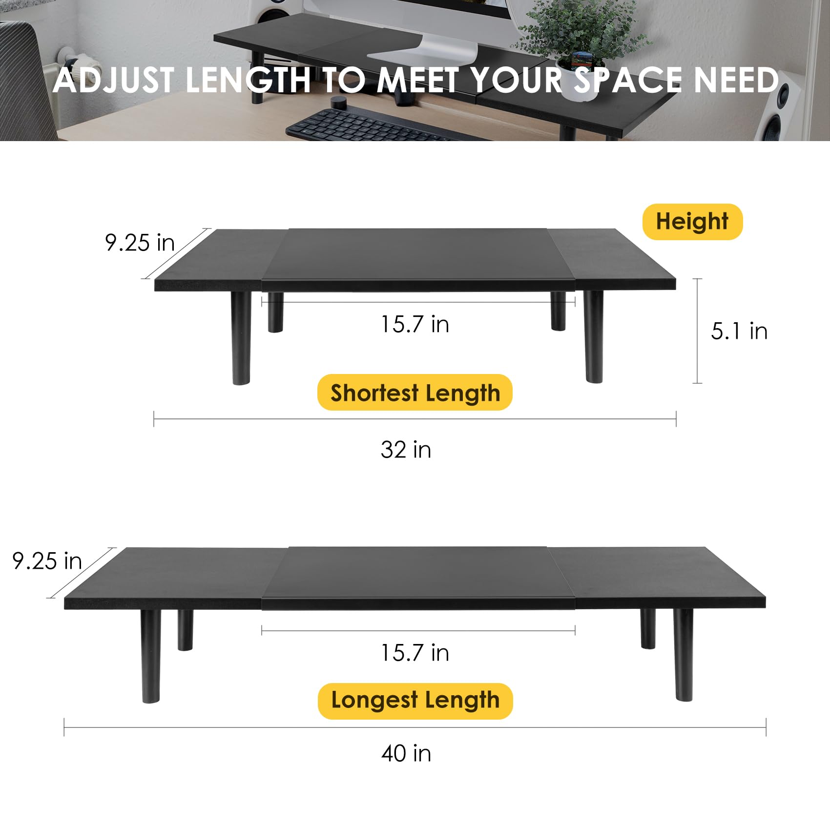 - ADJUSTABLE LENGTH MONITOR STAND:The length of the dual monitor riser for desk can be retractable from 32 in to 40 inch, you can flexibly adjust length according to the space and the different size of screen. You could adjust to the short length when you only need single monitor to save space. Adjusting to the long length if you need multiple computers to work at the same time.