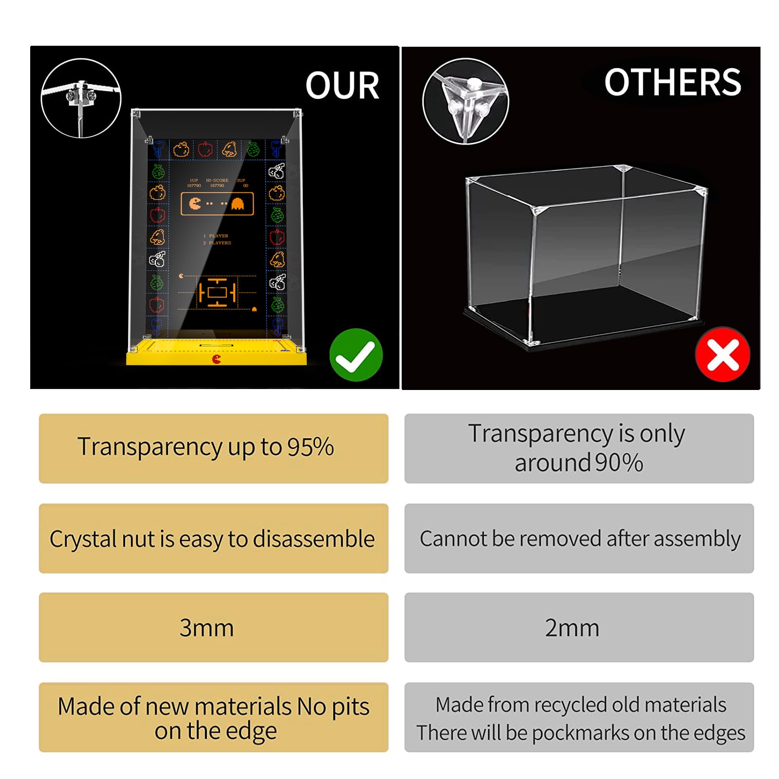 - 【Well Protection& Dust-proof】This acrylic display box keeps your LEGO Pac-Man Arcade Machine 10323 Building Kit dust-free, more than 98% transparent acrylic plate, so that the Lego display more clear, beautiful and durable, transparent and not yellowing.