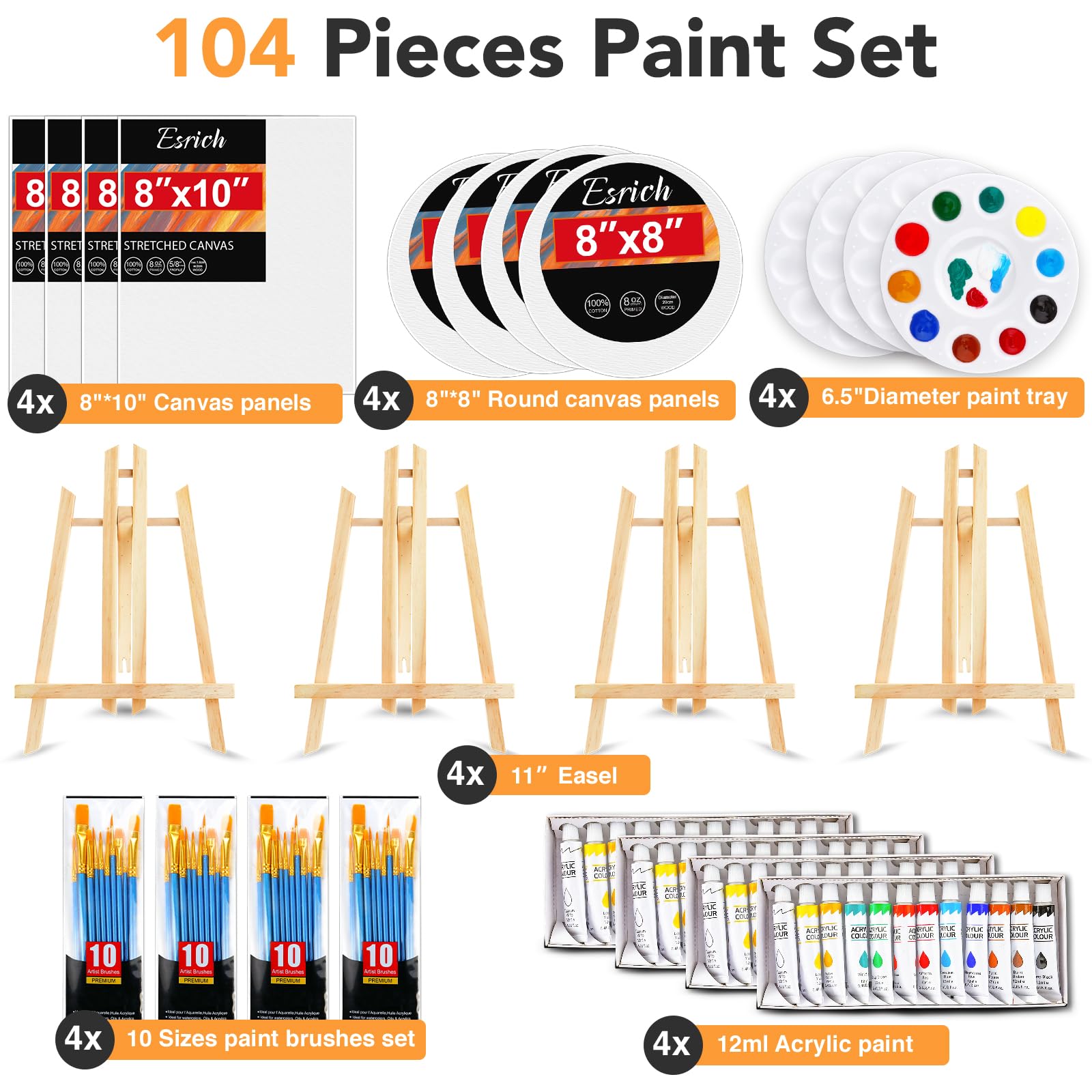 Acrylic Paint Canvas Set,104 Piece Professional Painting Supplies Kit with 4 Wood Easel,4 * 12Colors,4 * 10 Brushes,Circular Canvas Etc,Premium Paint Kit for Kids,Students, Artists and Beginner