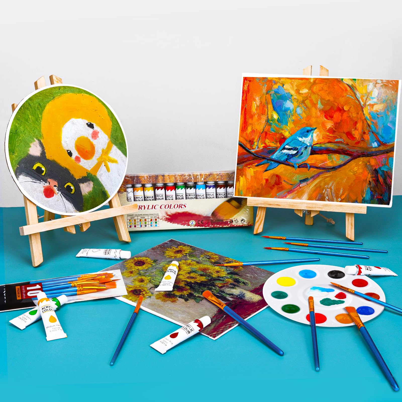 - 【Painting Set】: The set has 4 wood easels(11in), 4*10 PCS brushes, 4PCS 12 color tubes (12ml, 0.4 oz) acrylic paint, 4 palettes,4 PCS 8”*10” and 4 PCS 8”*8”round canvas and a gift box.