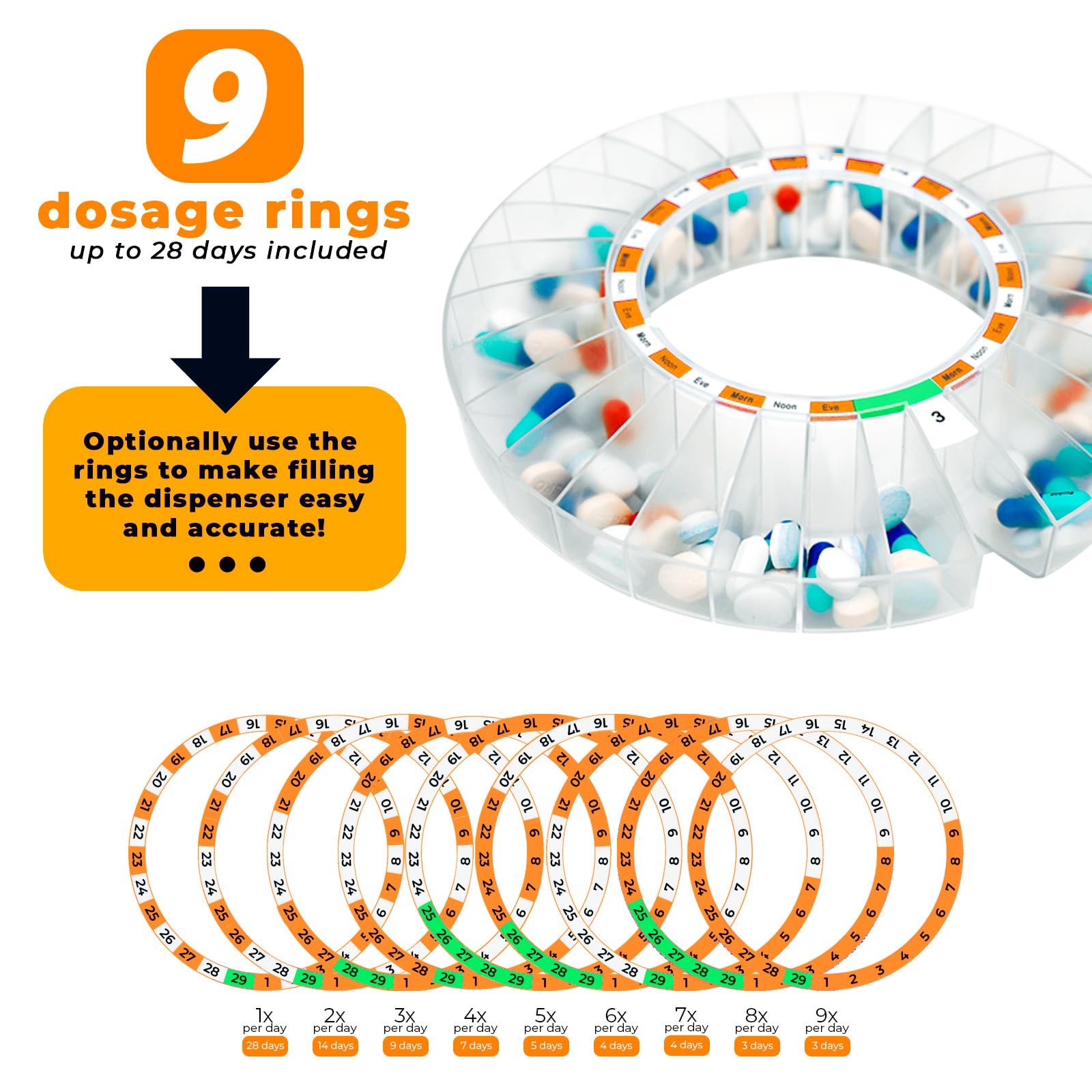 - EFFORTLESSLY EASY SETUP: Get started with ease using our free app, ensuring a hassle-free experience for both caregivers and elderly patients. We also include 9 different dosage rings, each corresponding to the required daily intake, up to 28 days. Simply place the desired dosage ring in the daily pill box organizer and start filling the compartments with meds. Then, in the app, you can effortlessly set the specific times for each dosage to be offered, allowing for precise medication management.
