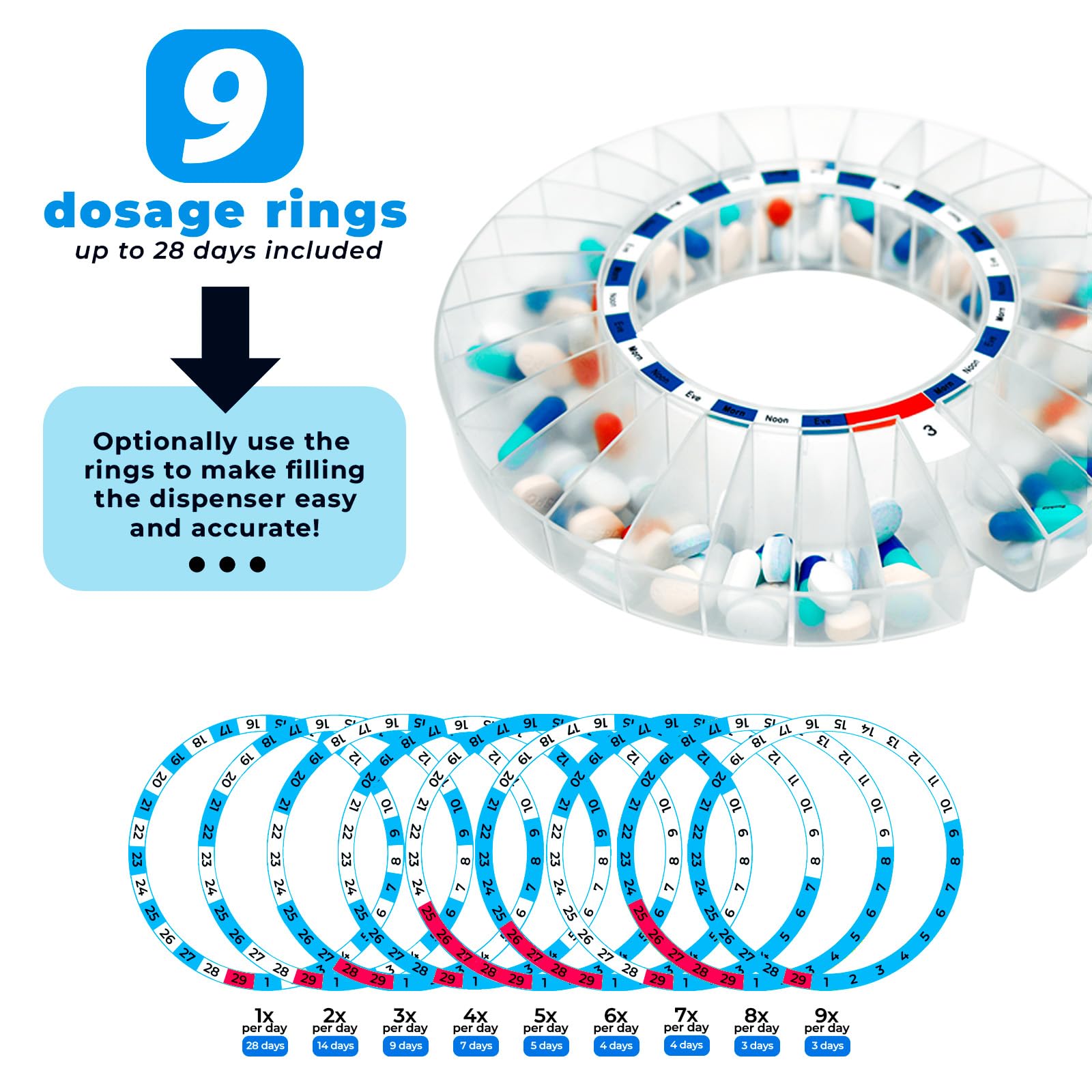 - EFFORTLESSLY EASY SETUP: Get started with ease using our free app, ensuring a hassle-free experience for both caregivers and elderly patients. We also include 9 different dosage rings, each corresponding to the required daily intake, up to 28 days. Simply place the desired dosage ring in the daily pill box organizer and start filling the compartments with meds. Then, in the app, you can effortlessly set the specific times for each dosage to be offered, allowing for precise medication management.