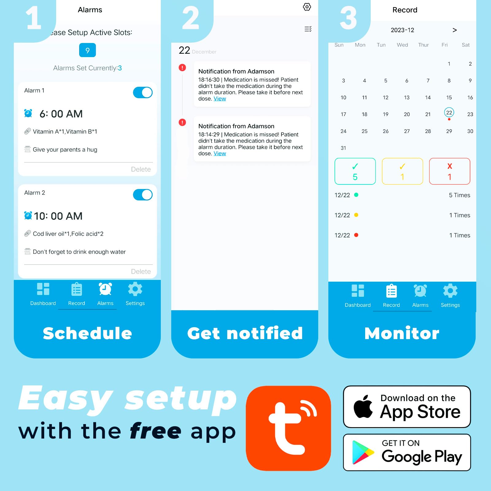 - FREE APP FOR SCHEDULING & MONITORING: Access our complimentary app for effortless organization, scheduling, and monitoring of the patient's medication, vitamins, and supplements from anywhere. Invite other caregivers and family members to connect, adding valuable supervision capabilities. Additionally, the app allows you to continuously monitor progress (making it ideal as vitamin holder organizer), send reminders, and more—all at no cost!