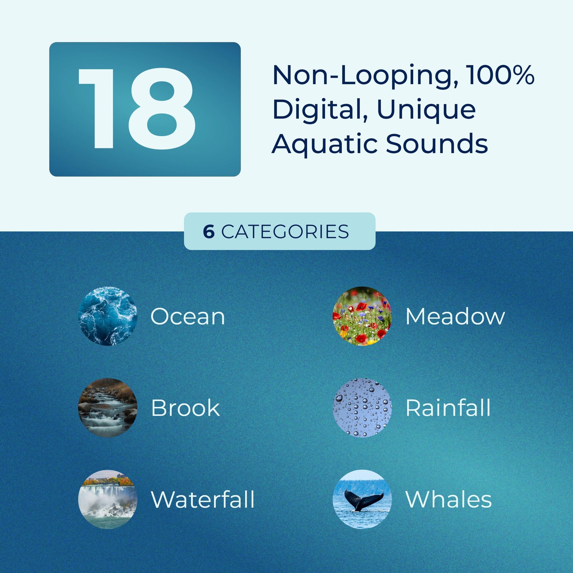 Details: The Aquarius features 18 unique non-looping water sounds across 6 categories. Soothing water sounds that help mask distracting noises and improve sleep, focus, and relaxation. Enjoy these water sounds through the speaker, Bluetooth, or the headphone jack. You can also play your audio through Bluetooth. The Aquarius is travel-friendly and rechargeable, allowing you to bring it wherever you go.