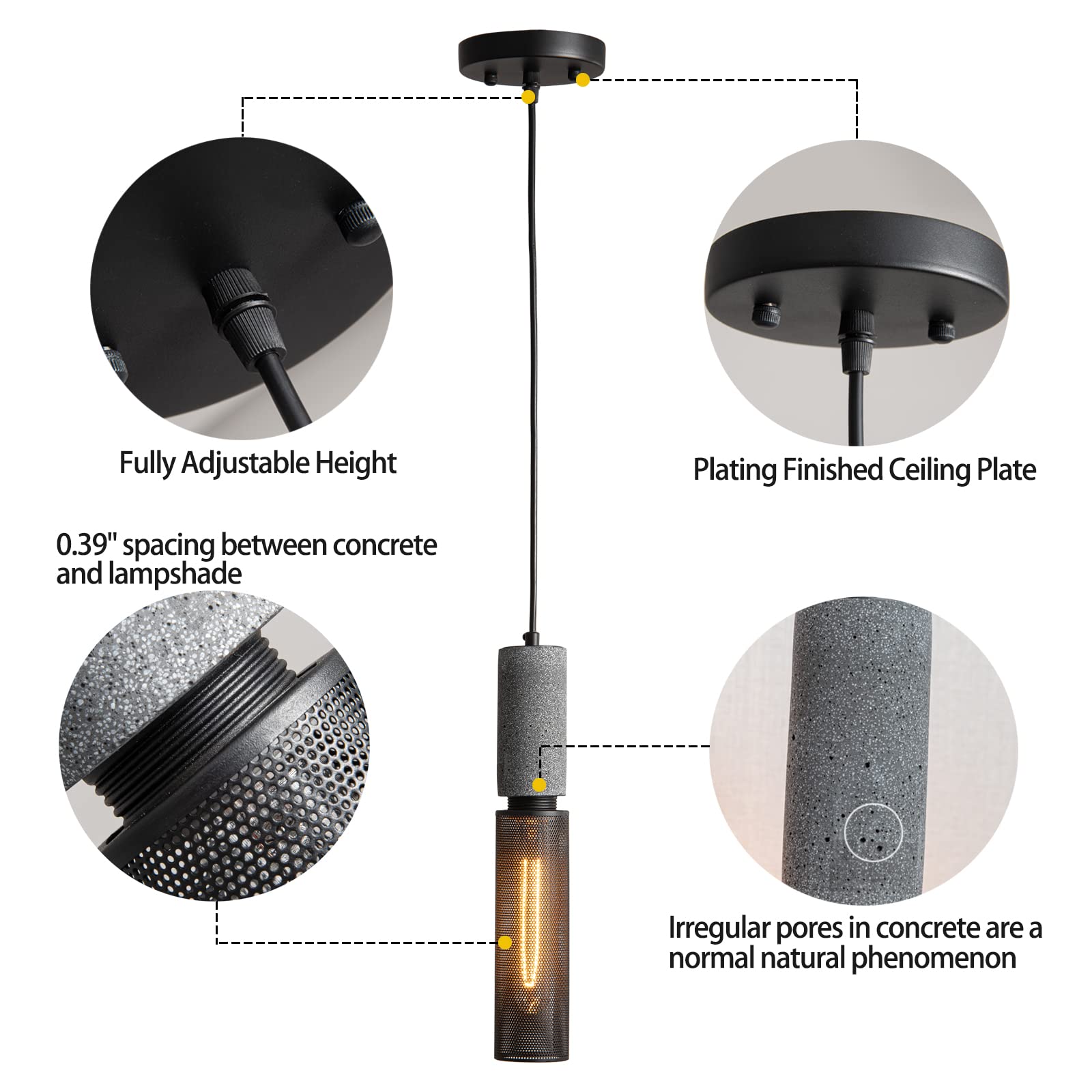 - 【Specifications】 Pendant Light overall height: 73.2 inch, Concrete and Metal Mesh Shade: H13.2 inch x D2.36inch, Ceiling base: 4.7 inch x0.78 inch; Adjustable cord: Max 73.2 inch. It can be adjusted in length and installed on a sloped ceiling. Pls note the size before purchasing.