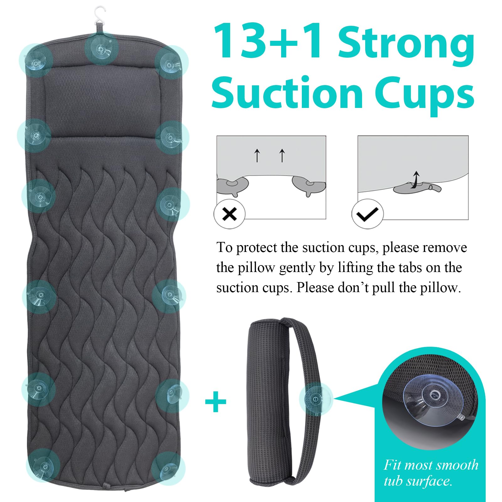 - 14 NON-SLIP SUCTION CUPS:This full body tub pillow includes 14 strong suction cups, 13 on the cushion and 1 on the extra lumbar pillow. Stay put through your bath experience. And after bath, please do not pull the pillow. Just lift the tabs on the suction cups for easily remove