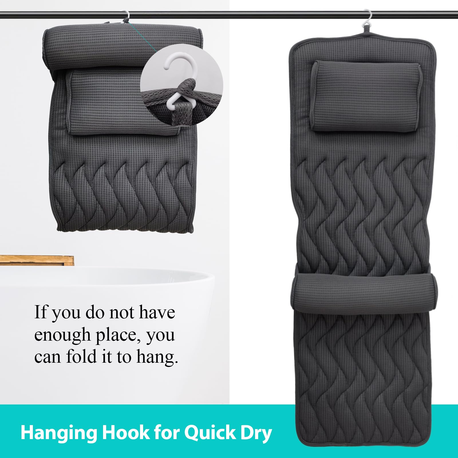 - EASY TO WASH and DRY FAST:This Full Body bath pillow attached a big drying hook on the back. After your soaking bath time, you can hang it up with the hook. We also choose beautiful color air mesh fabrics for our full body tub cushion, which is high grade material. The full body bathtub cushion is machine washable and comes with a laundry bag