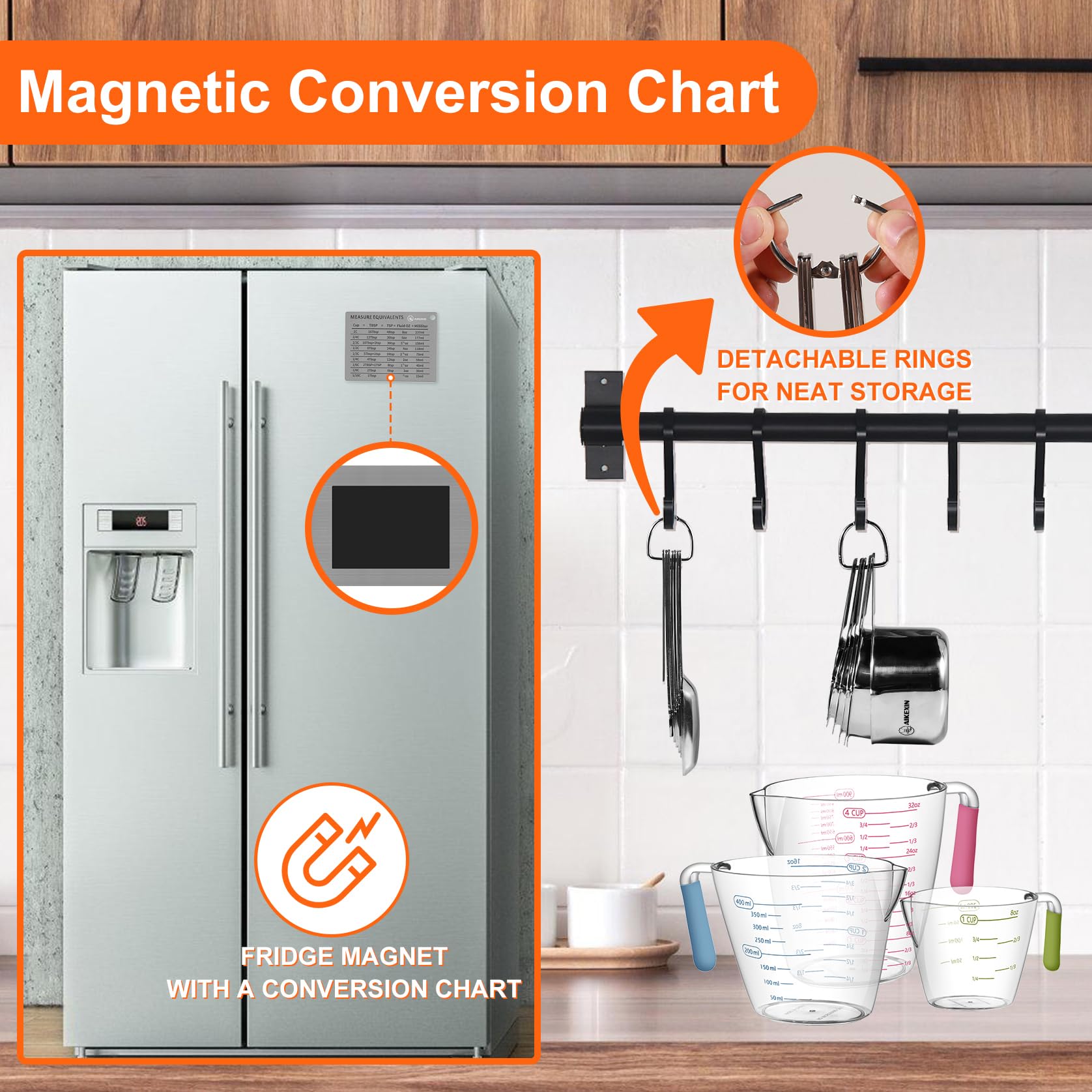 - [Easy to Read Measure]: Each measuring spoons and cups is clearly engraved with the scale mark, making it easy to read the measurements. The rectangular design of the measuring spoons allows them to fit easily into small spice jars or herb containers, making it easier to measure both dry and liquid ingredients. With this measuring set, you can confidently create delicious food for your family and friends.