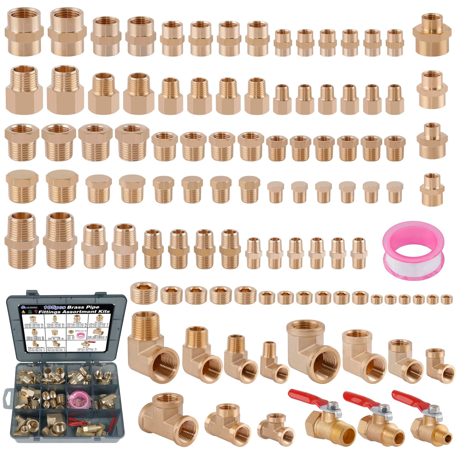 Ailbiuko 105PCS Brass Pipe Fittings Assortment Kit NPT Adapter,Reducer Bushing, Hex Nipple, Reducing Hex Coupling,90 Degree Street Elbow,Street Tee,Ball Valve,Hex Head Plugs,Socket Plug Fittings Kits