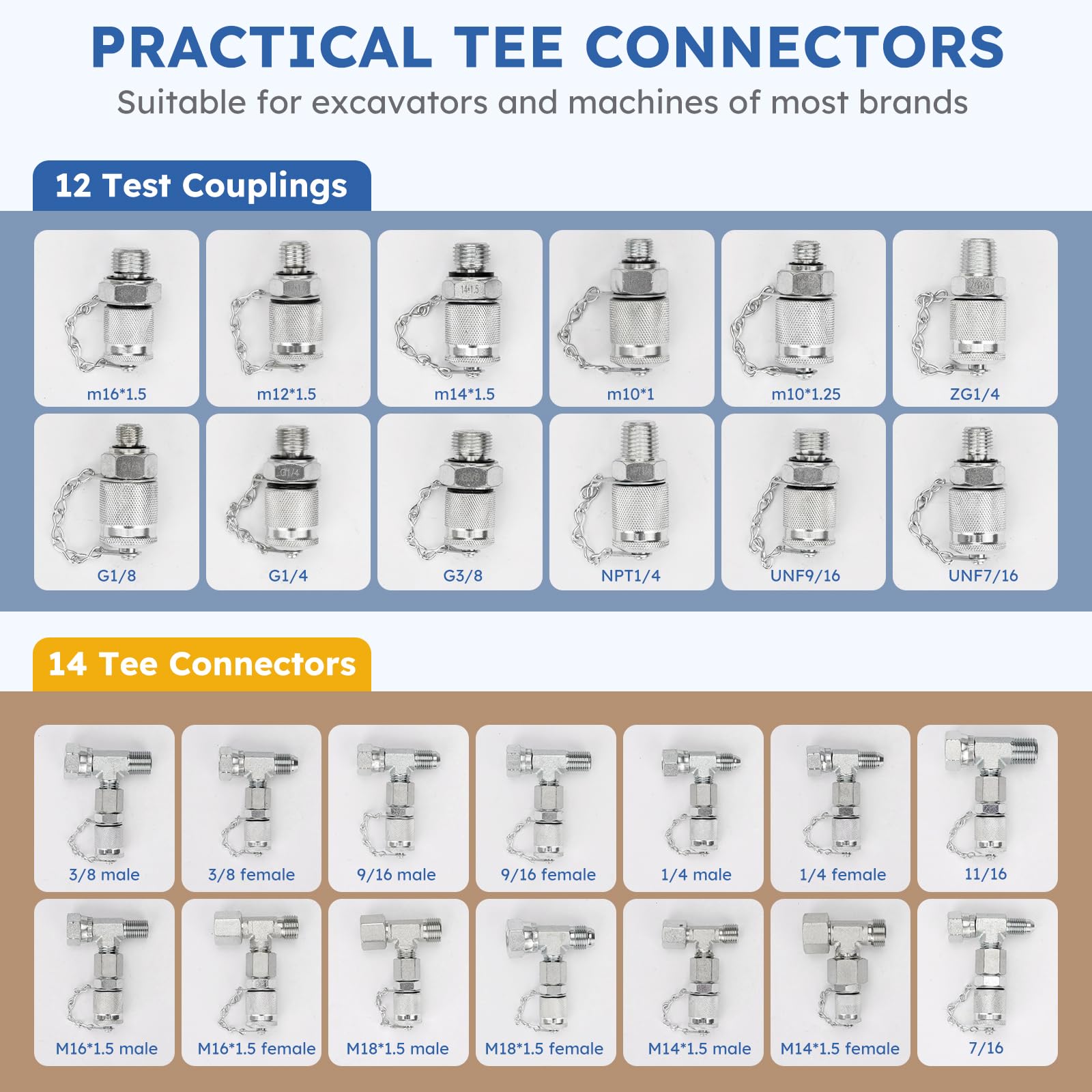 - ✔ AilemeNova Hydraulic Pressure Test Kit - All in one kit: 12 x Test Couplings AIKG, 14 x Tee Connectors, 5 x Hydraulic Test Guage, 1 x Carter Quick Connector, 1 x Portable Storage Case, 5 x Test Hose