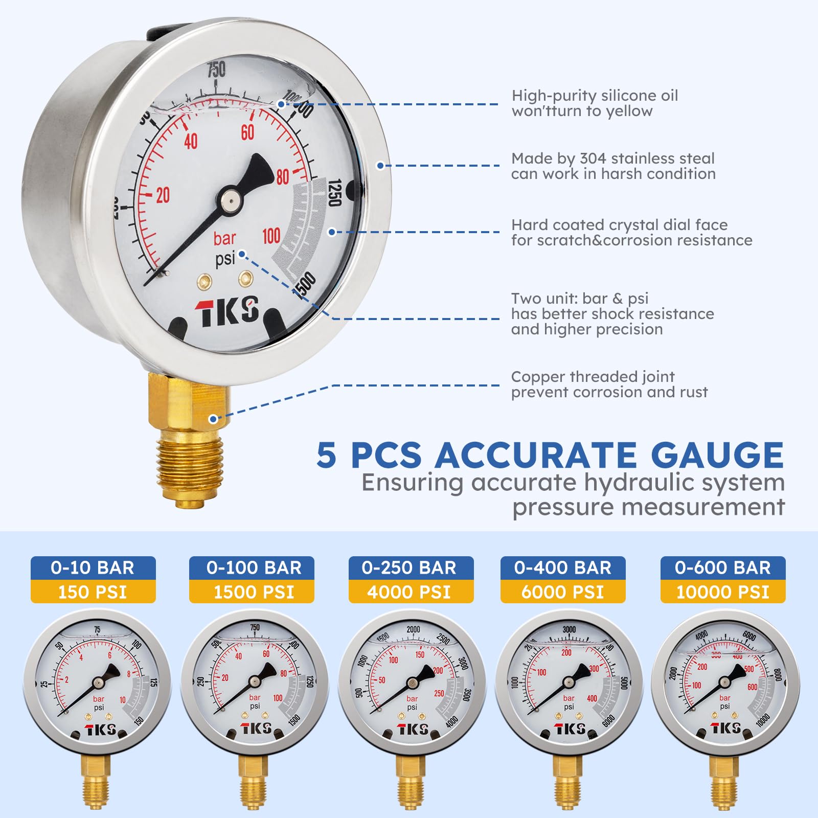 - ✔ 5 Accurate Reading Gauges with Max 600bar / 10000psi / 60mpa Working Pressure: The AilemeNova hydraulic pressure gauge has five different ranges pressure gauges: 0-10bar/150psi, 0-100bar/1500psi, 0-250bar/4000psi, 0-400bar/6000psi, 0-600bar/10000psi. It is easy and accurate to read all the pressure measurement by the clear display screen, efficient and convenient during the daily use.