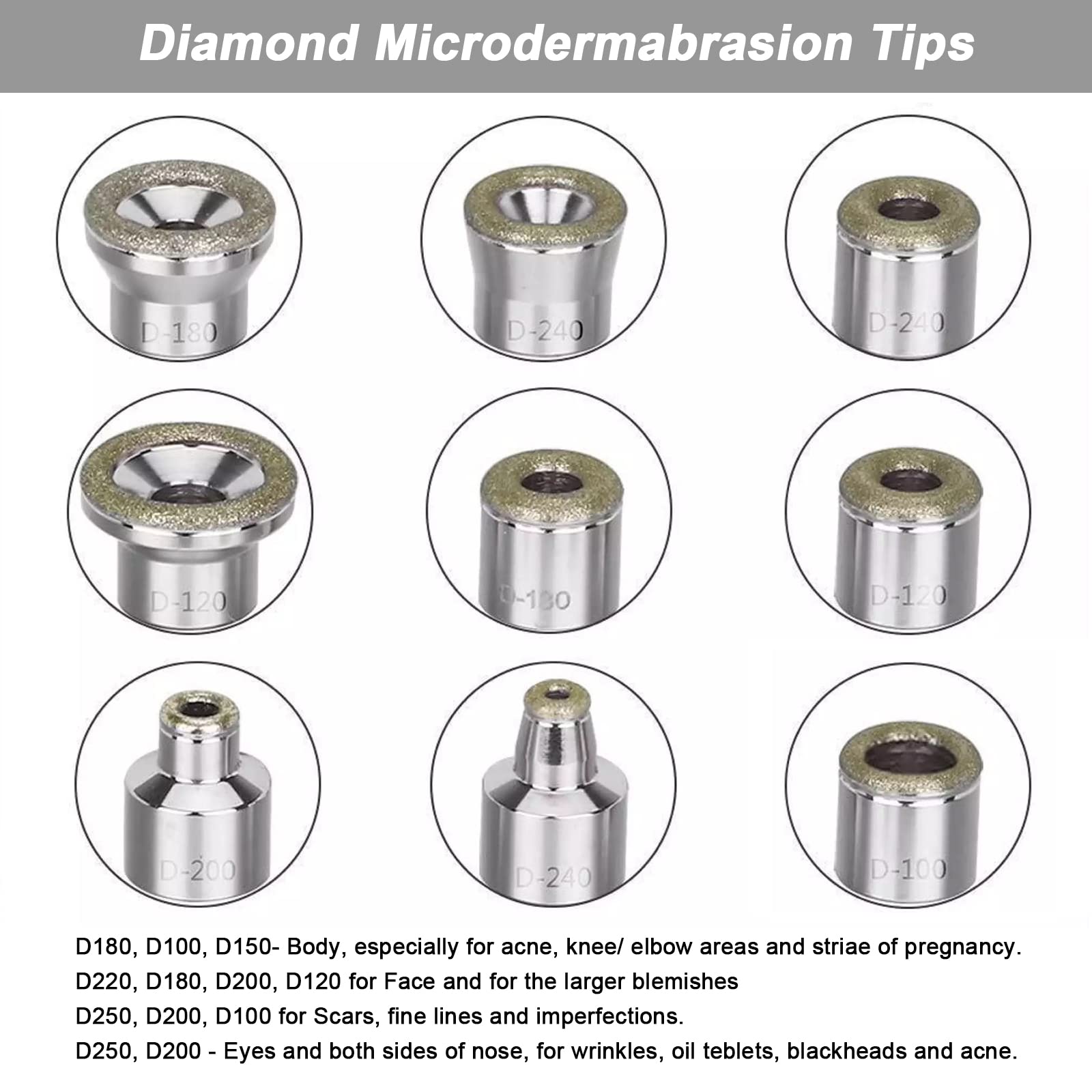 - đă9 Replacement Diamond TipsăComes with 3 kinds of diamond wand and 9 different diamond tips.The diamond tips can be used in different needs and different parts of face or body. Depending on your skin's thickness, choose the appropriate diamond tip.