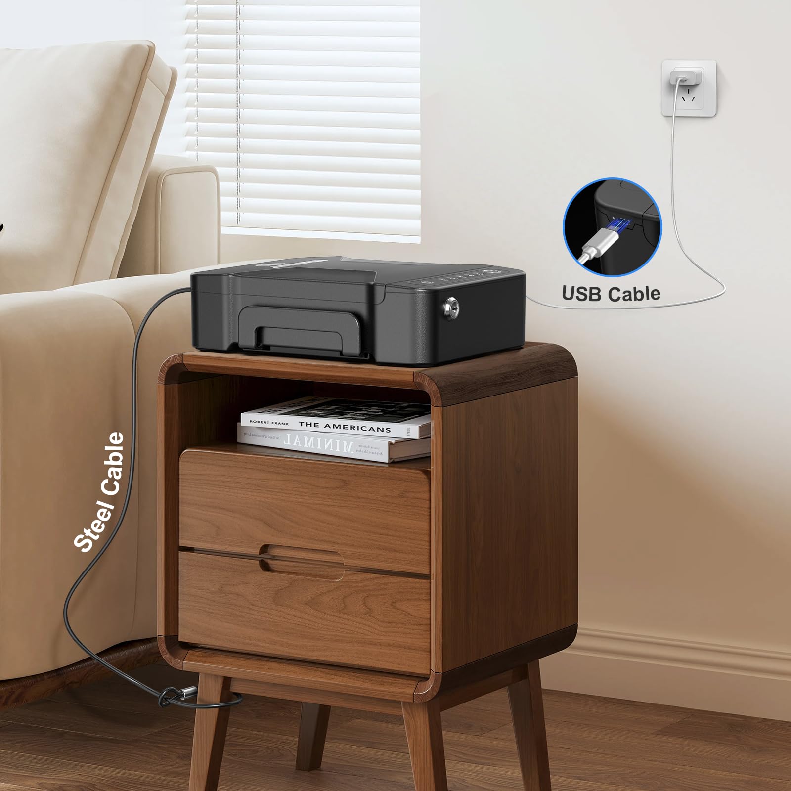 - 【Enhanced Features】The gun safes built-in LED lighting for friendly accessing content in the dark, USB-C charging for convenience, and heavy-duty steel cable for added security. In addition, fingerprint safe also has a mute mode. Designed with user experience in mind, this gun lock box is a reliable option among gun cases for handguns and pistol safes.