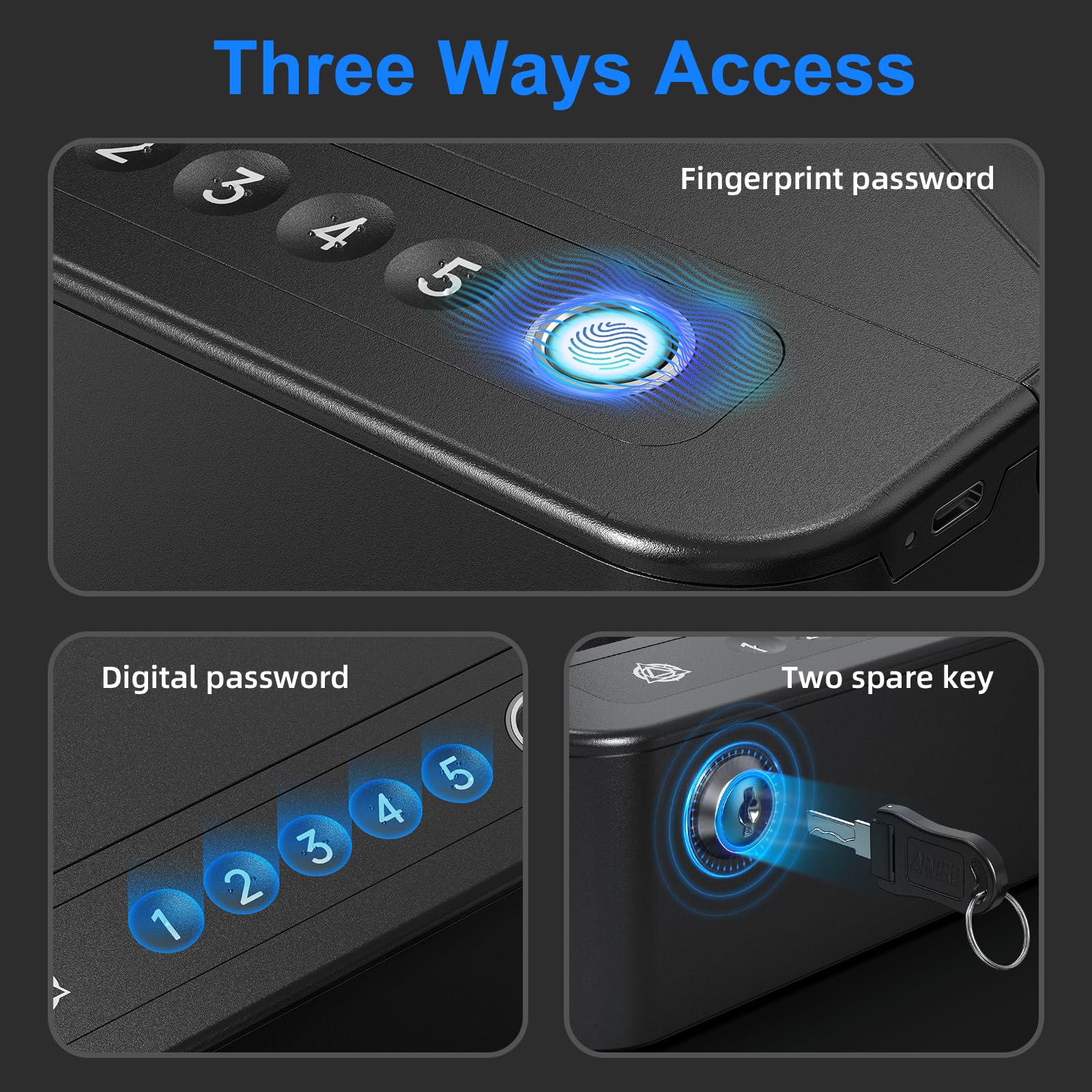 - 【Lightning Fast Access】Unlock your pistol safe in just 0.5 seconds with advanced fingerprint recognition. With three versatile unlocking methods—biometric fingerprint, digital keypad, and traditional key—you can quickly retrieve your firearm when every second counts, without sacrificing security.