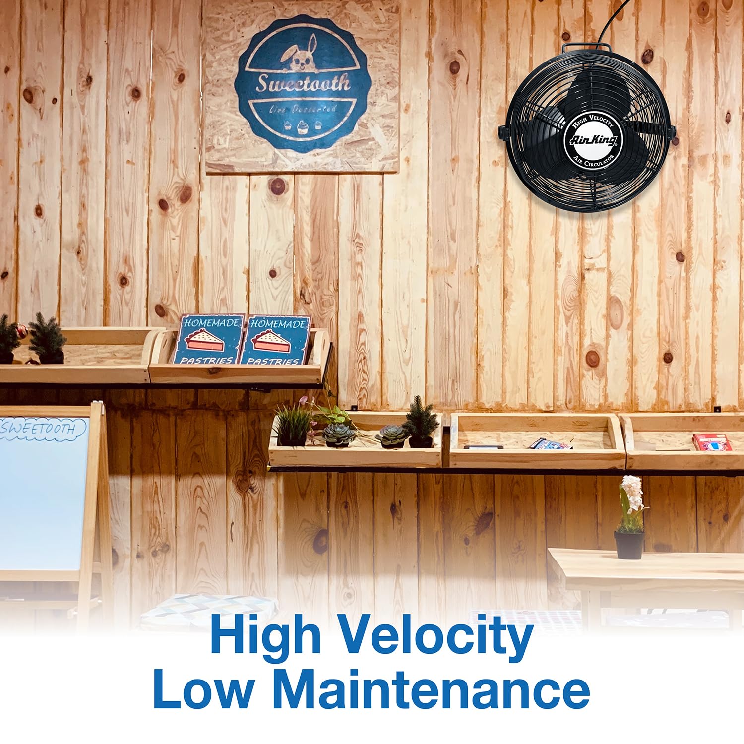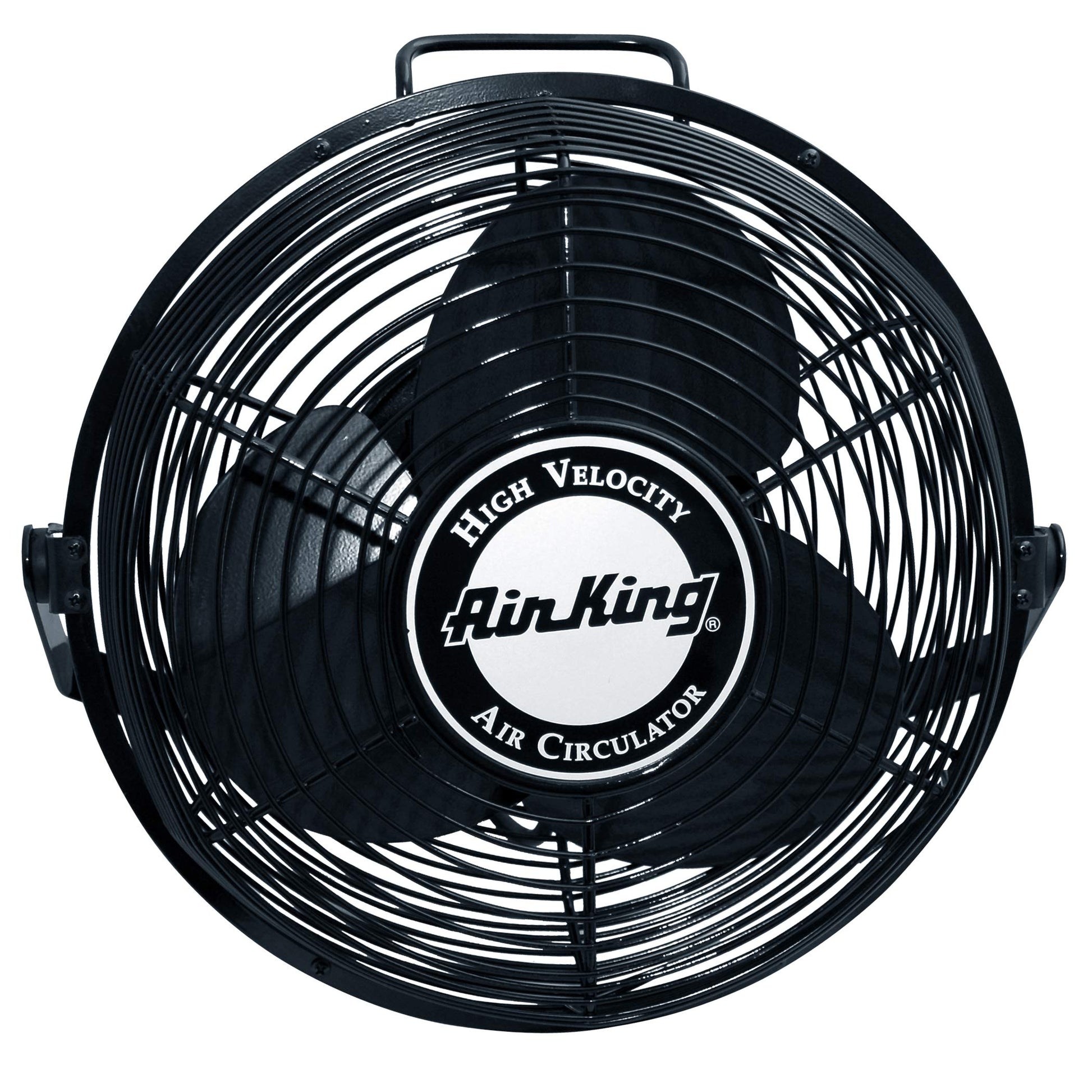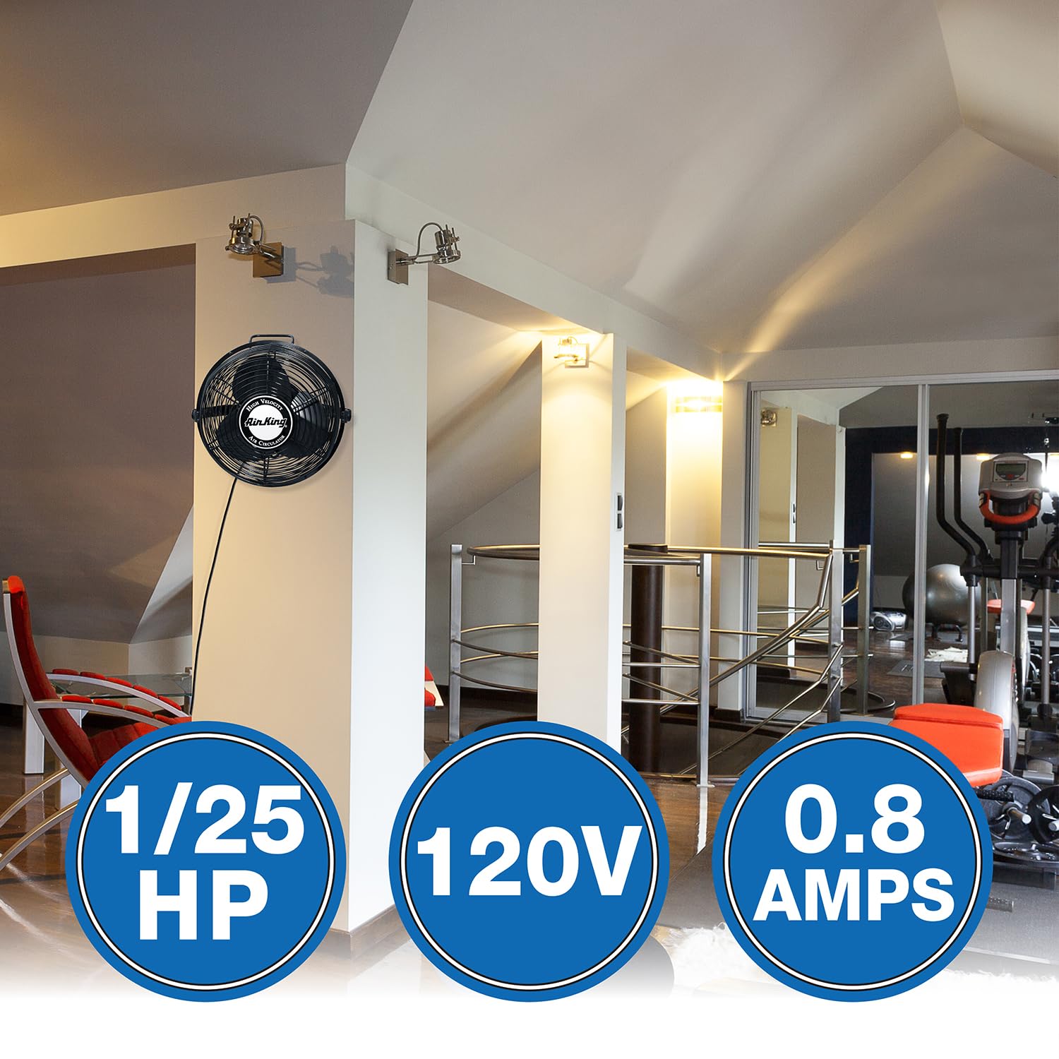 Details: The Air King 9312 Industrial Grade Wall Fan is used to cool and circulate air in industrial or commercial settings including loading docks, warehouses, health clubs and other commercial or industrial spaces. This fan can be monted to a wall, ceiling or I-beam to save floor space. With a powerful motor and steel construction this fan is the perfect cooling and air circulation solution. Air King has added a tough powder coat finish to the blade guard. This unit is tested in accordance with AMCA standard 230-99, meets the requirements of ARRA and is ETL and OSHA compliant. It copmes with a 1 year limited warranty. The fan is equipped with a 3 speed, 1 phase, open motor, sleeve bearing and permanent split capacitor. It moves 1360, 1170 or 1010 cfm on high, medium or low speed. The motor is rated at 0.8, 0.6 and 0.5 amps, 85, 76 and 64 watts and 56, 49 and 42 decibels on hegh, meduim and low speed. The fan head pivots to direct air flow. Features a single bolt mount for fast installation. Secondary support cable included. Other features include rear mounted pull cord, steel handle, steel blade guard and 9 foot, 3 conductor SJT type power cord. About Air King