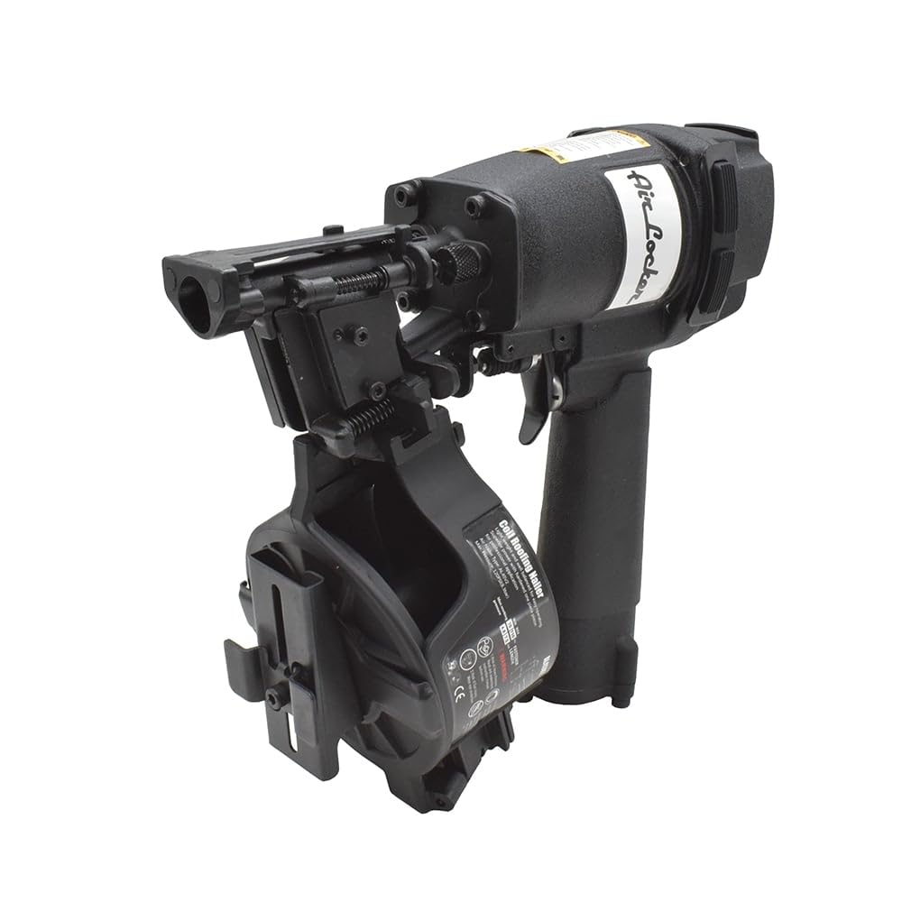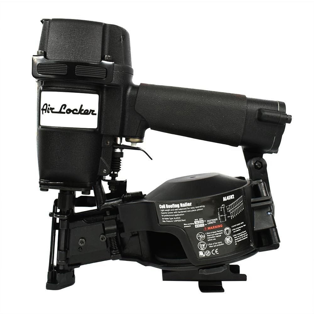 Details: The Air Locker AL45V2 7/8” to 1-3/4” Coil Roofing Nailer is the ideal nailer for construction applications such as roofing, decking, insulation board, fiber cement, insulation board, shingles and much more! Manufactured for the professional with a lightweight and durable aluminum housing and easy loading side magazine to drive the most nails. Features non-slip rubber grips as well as non-slip rubber guards to ensure the nailer does not slip off while working on uneven surfaces. With a side-loading canister, zero nail lock-out, and easy depth of drive adjustments the AL45V2 is a must-have tool for professional construction workers, roofers, and builders.