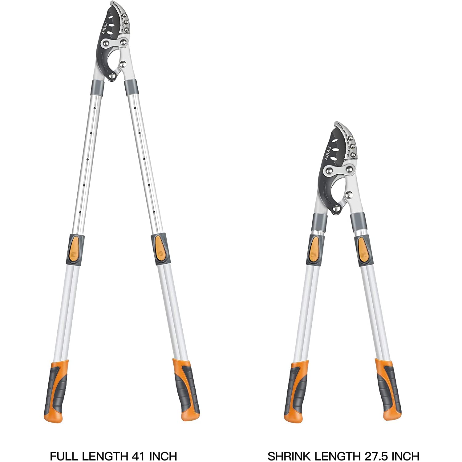 - Loppers Heavy Duty: Telescoping aluminum handle with 6-step telescoping design, adjustable from 27-41 inches.
