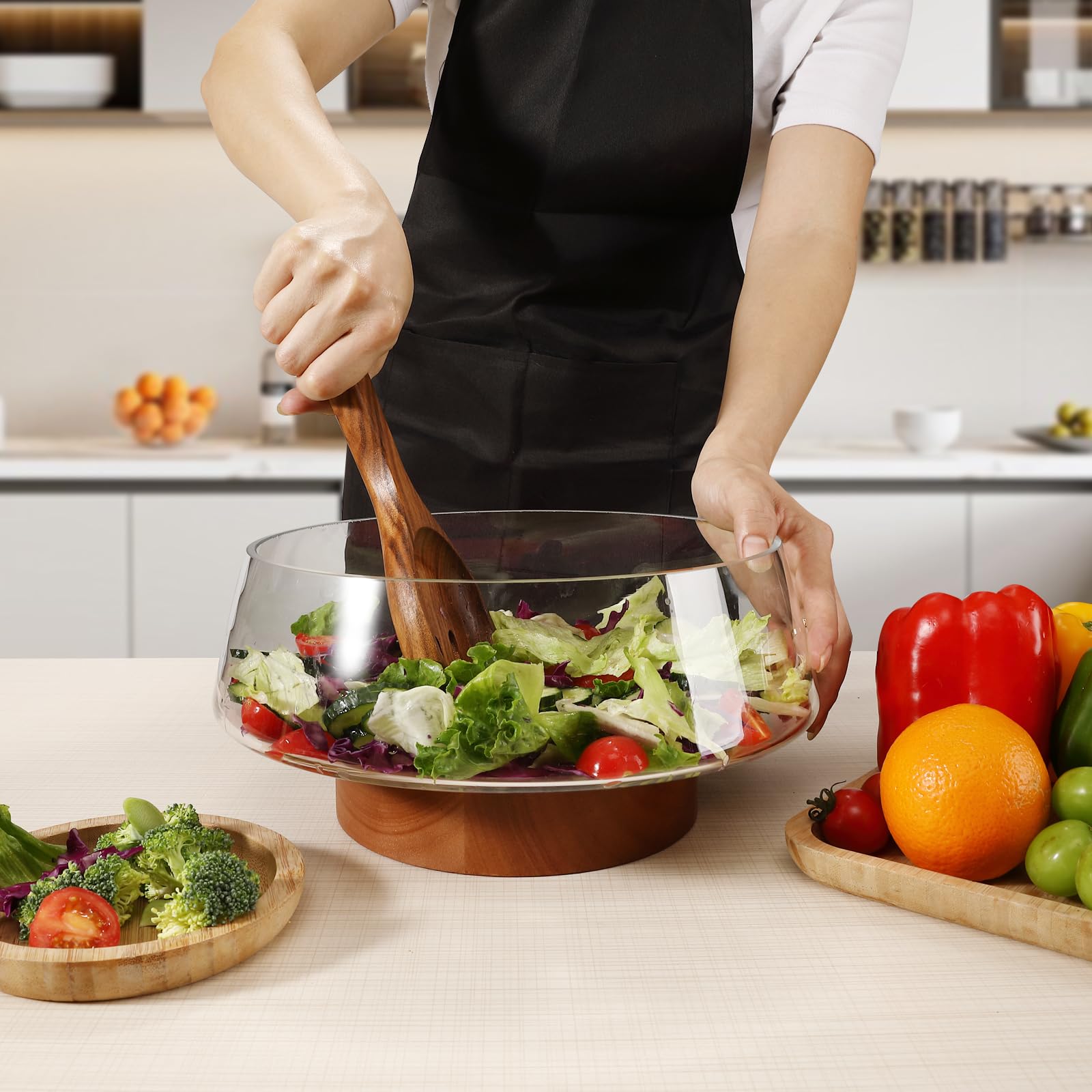 Airsent Glass Salad Bowl Set with Wood Base Servers, Extra Large Hand Blown Salad Bowls Kitchen Must Haves, Big Serving Bowl Elegance Trifle Bowl Glass, Wooden Kitchen Utensils for Party