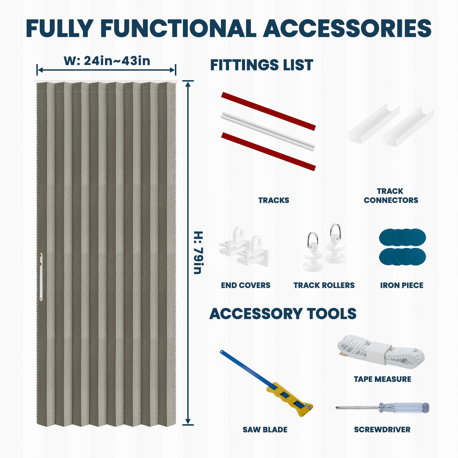 AJAZZ 100% Blackout Magnetic Accordion Door Curtain - Invisible Folding Panel for Bedroom, Living Room, Doorway - Curtain Sets Includes Tracks (1 Panel, 43W x 79L, Grey)