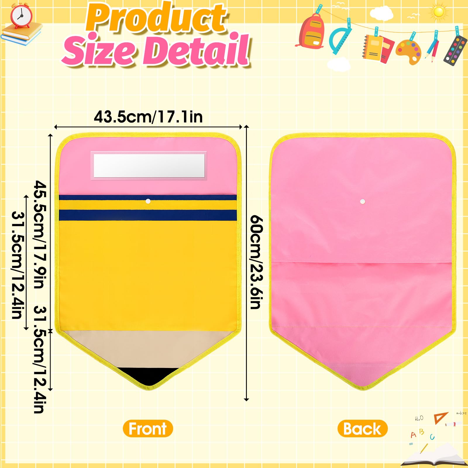 - Large Capacity and Easy to Install: The dimension of seat pockets for classroom chairs measure 18 inch (H) x 17 inch (W) that offer large storage space, the unique pencil shaped seat sack must be loved by all students, classroom must haves. What's more, our classroom chair organizer is easy to install, just put the chair sack on the back of the chair, our chair pockets are suitable for most classroom chairs.