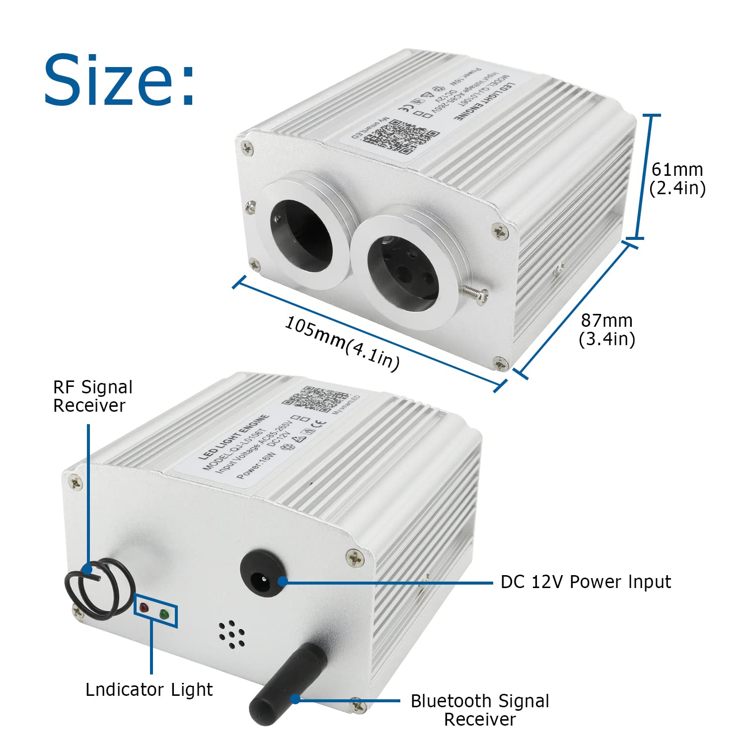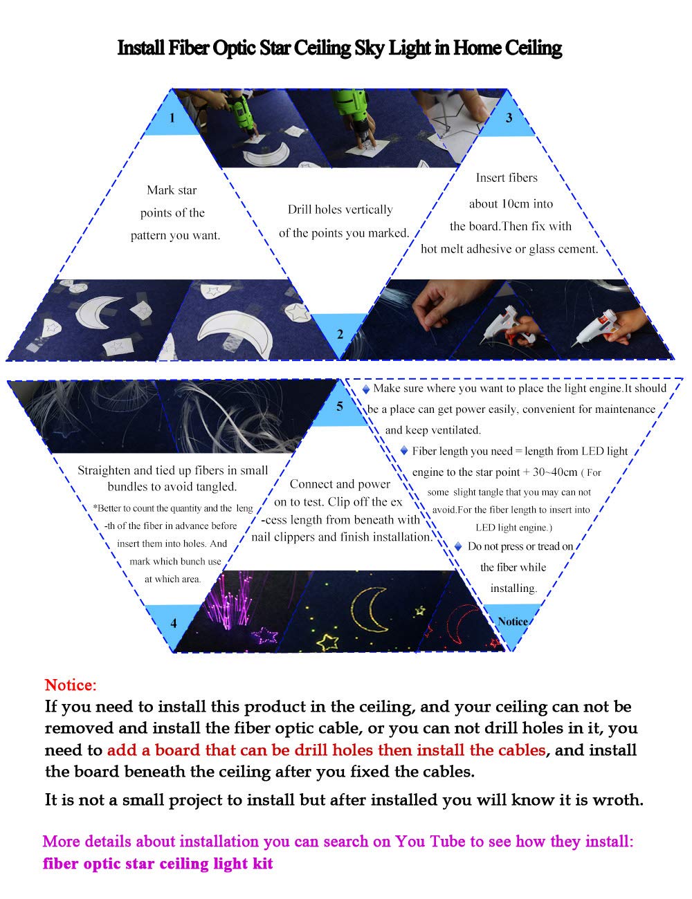 - 【UPGRADED Dual Head + Twinkle + Music Effect】This dual-head version light engine can install twice as many optical fibers as the traditional single-head 10W light engine. Can make more realistic fiber optic star ceiling sky light with twinkle effect. Upgraded with sound sensor mode (music /voice activated).