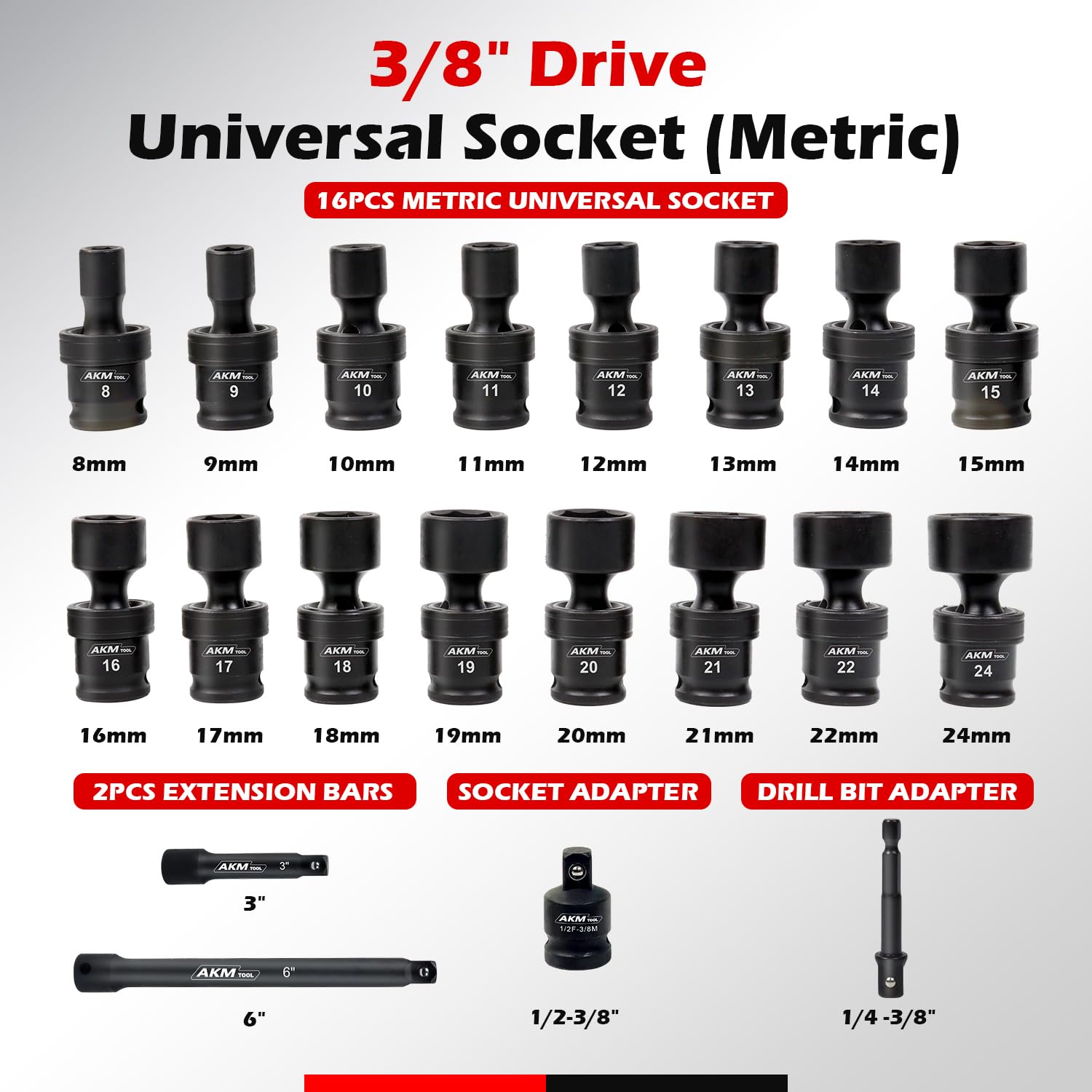 - INCLUDES: 16PCS 3/8" DR universal impact socket: 8mm,9mm,10mm,11mm,12mm,13mm,14mm,15mm,16mm,17mm,18mm,19mm,20mm,21mm,22mm,24mm. 2PCS extension bars: 3",6" , 1PCS drill bit adapter:1/4'', 1PCS impact socket adapter 1/2''-3/8''.