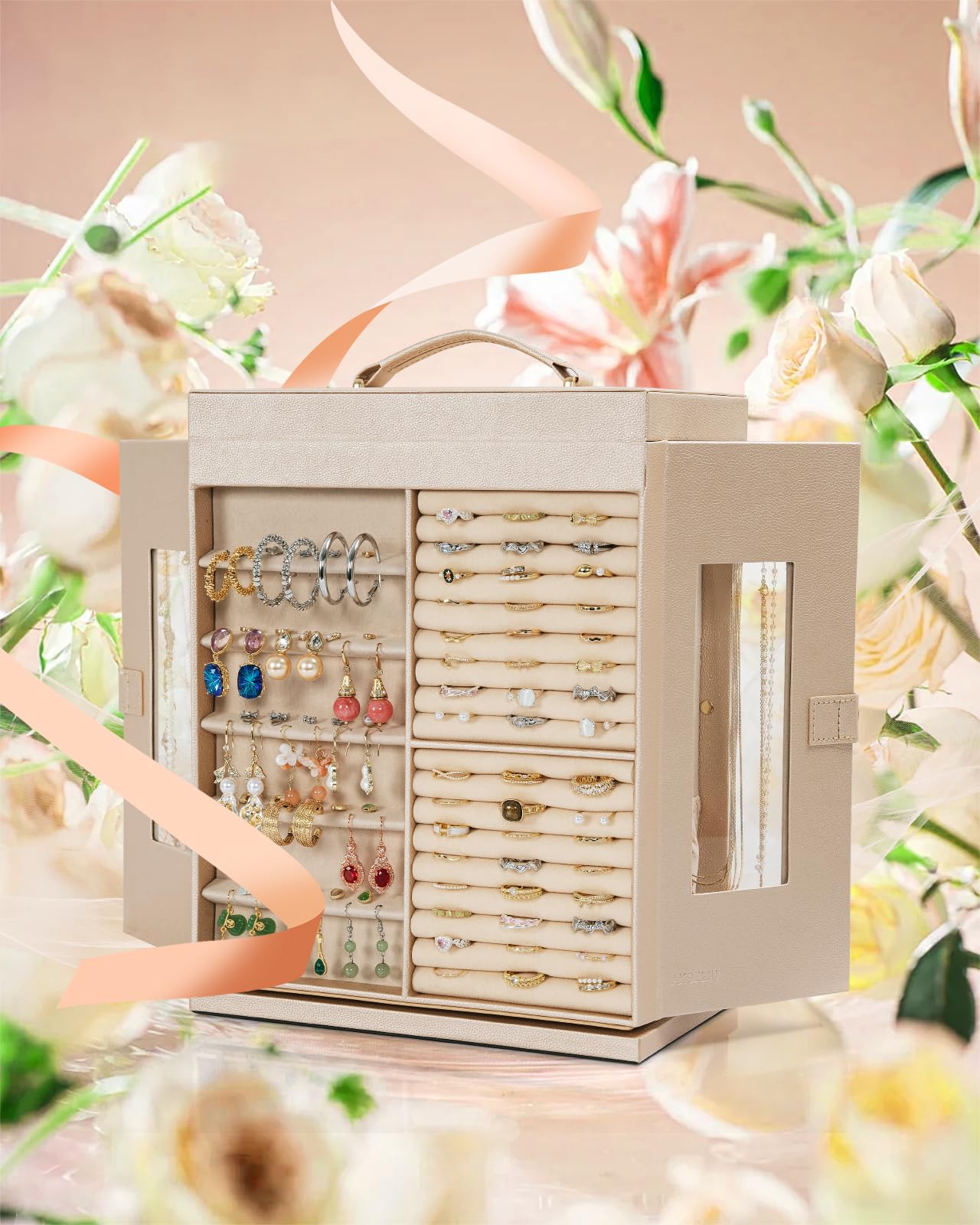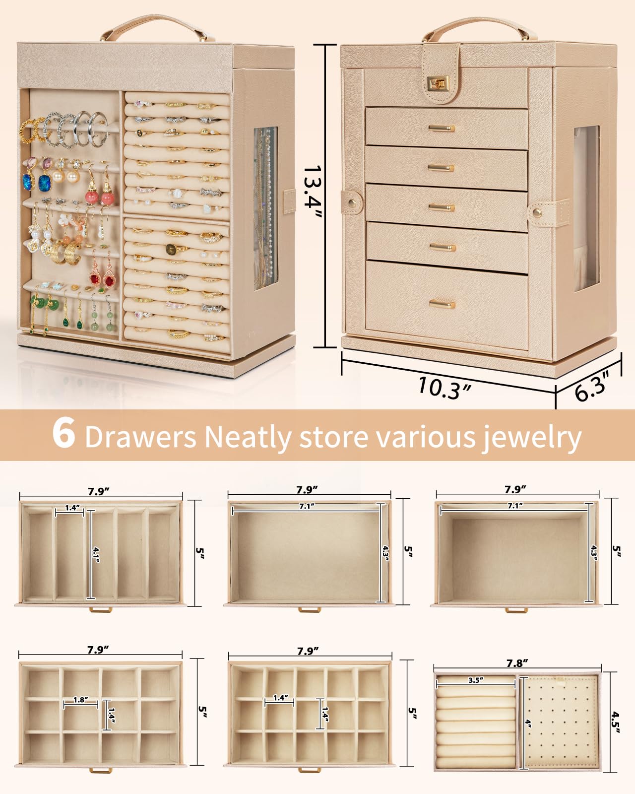 AKOZLIN Jewelry Box 360° Rotating 6-Tier Functional Jewelry Storage Case Organizer for Women Girls Ring Necklace Earring Bracelet Holder with Mirror