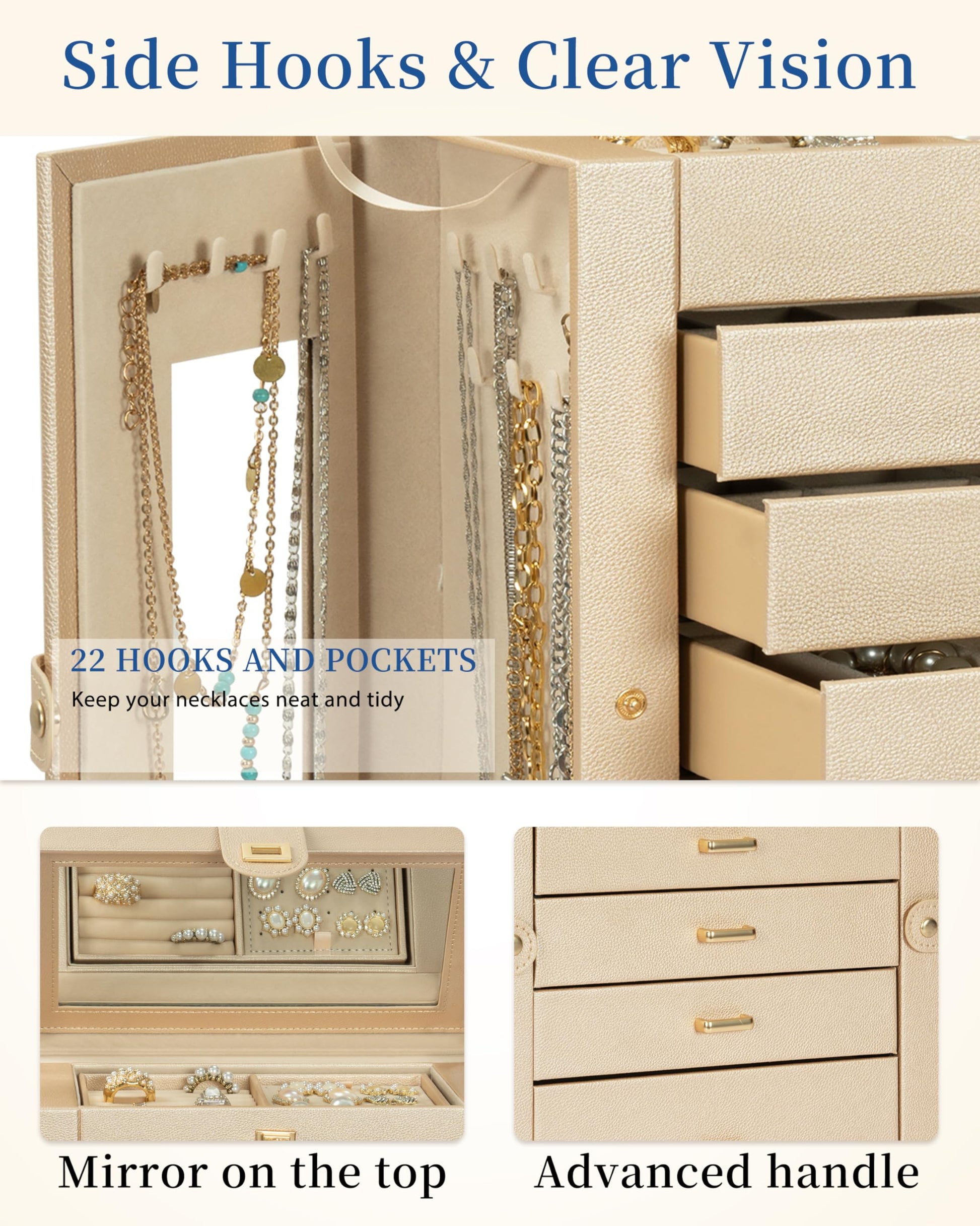 - Large Mirror Handle, This jewelry box comes with a built-in large mirror on top lid, making it easier to dress yourself. The lid has a ribbon attached to keep it from falling back. With a grab-and-go handle, convenient to move it; delicate buckle for one-hand easy opening, easy to use and saving your time at home