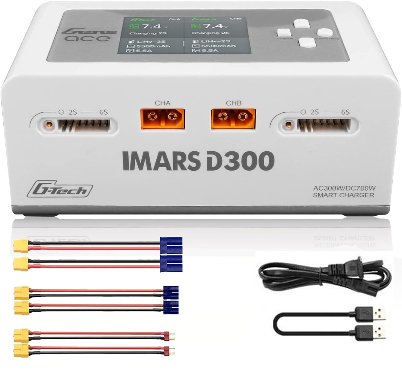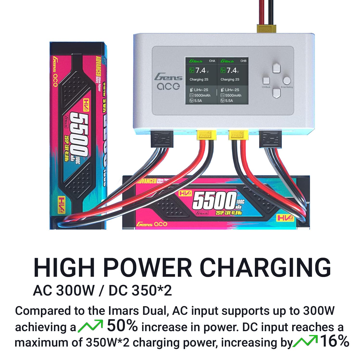 - 【G-Tech Smart LiPo Charger - No Manual Setup Needed】 The Imars D300 Dual Channel Charger features a built-in smart chip that automatically detects G-Tech smart battery information. It handles charging automatically and stops when the battery is fully charged.