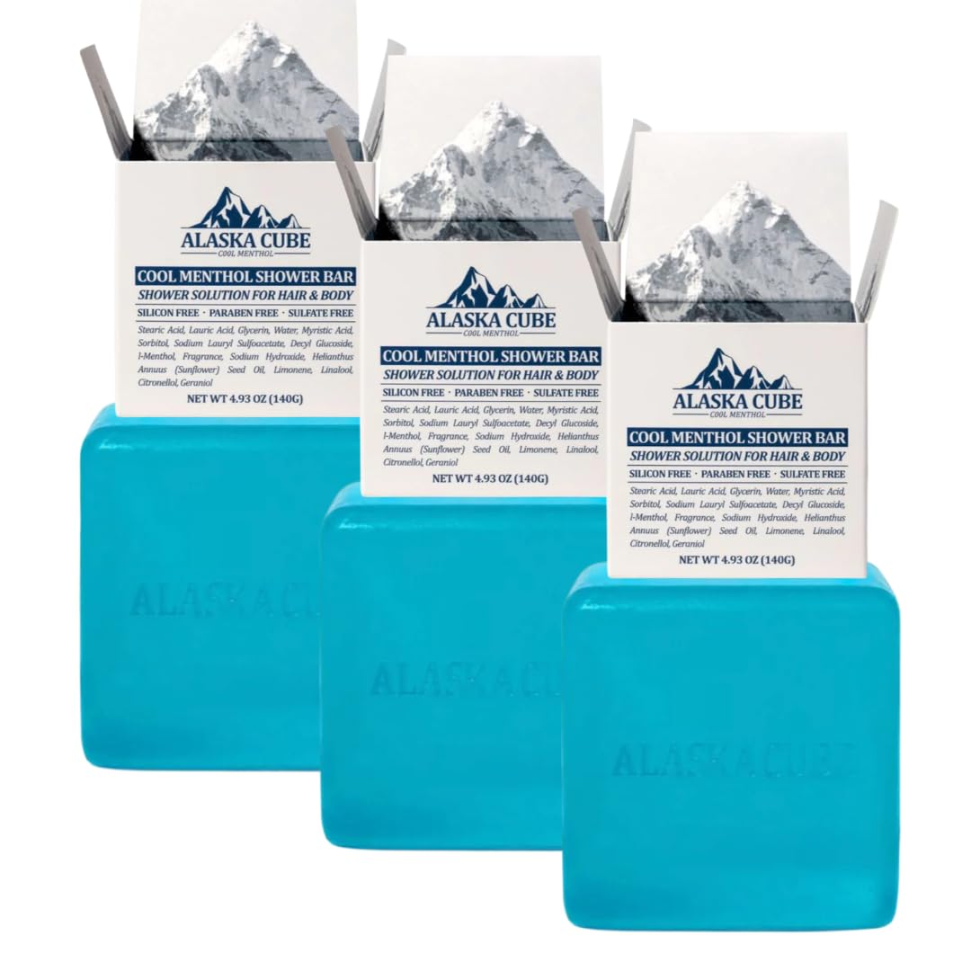Alaskacube Cool Menthol Shower Bath Body Soap Bar Cleanser Refreshing Cooling Effect Rich Foam for Body (Pack of 3) | 3% Menthol | Body Wash, Shampoo for Men Women Bundle Value Set (Mint, Menthol)