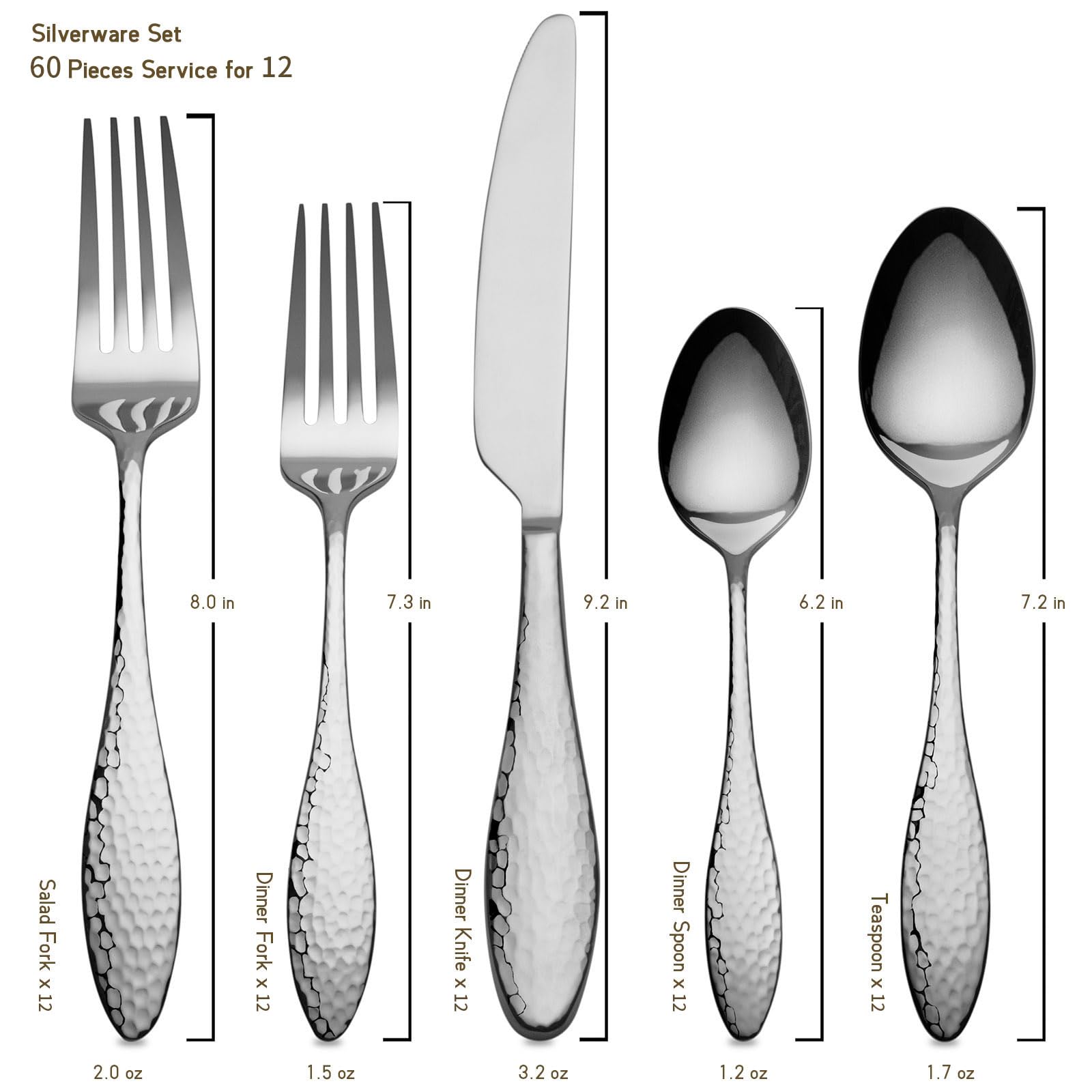 Alata Emma 60-Piece 18/10 Silverware Set, Hammered Flatware Set, Heavy Duty Stainless Steel Cutlery Set, Modern Kitchen Utensils, Dinnerware Sets Service for 12, Mirror Polished & Dishwasher Safe