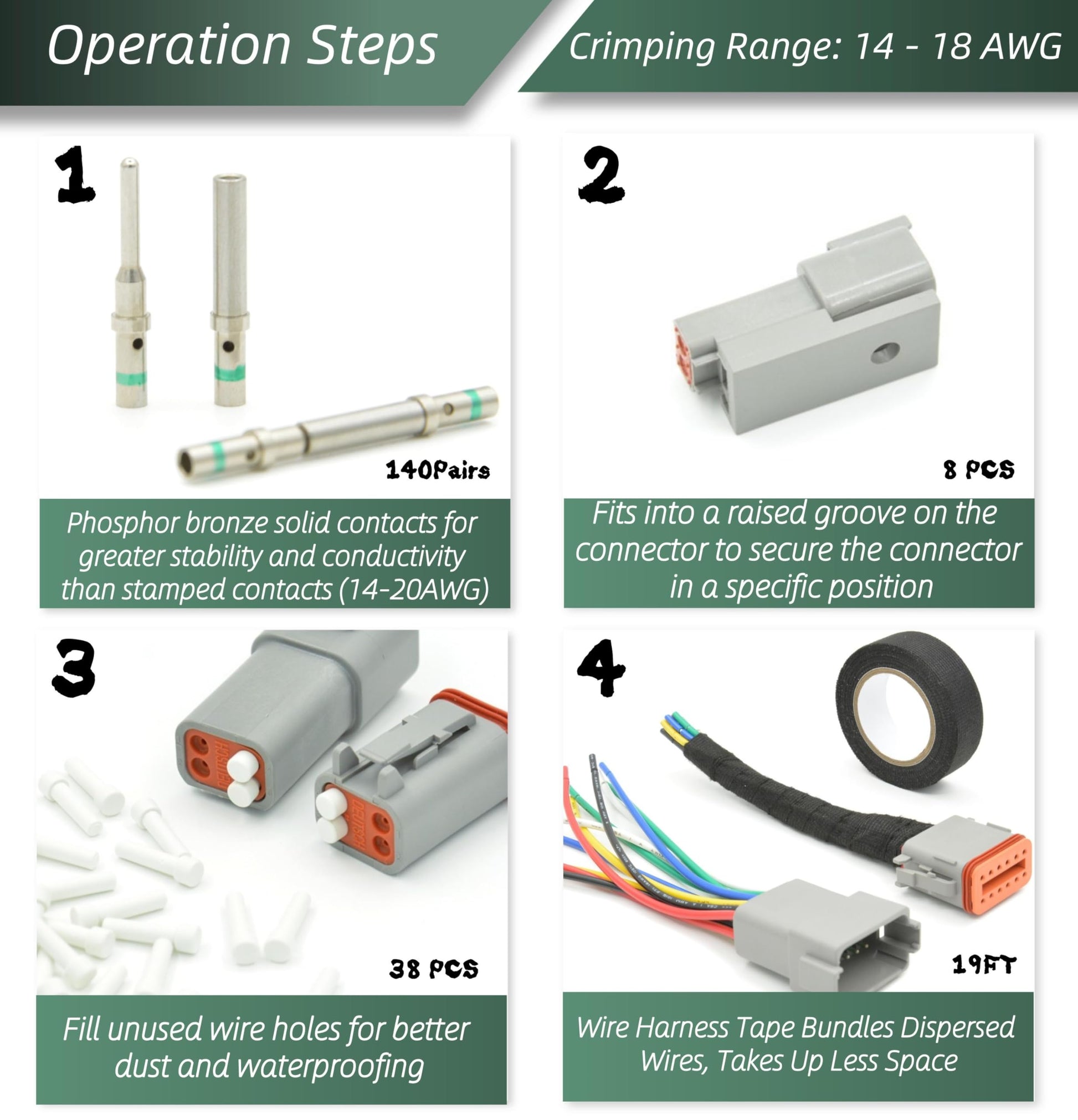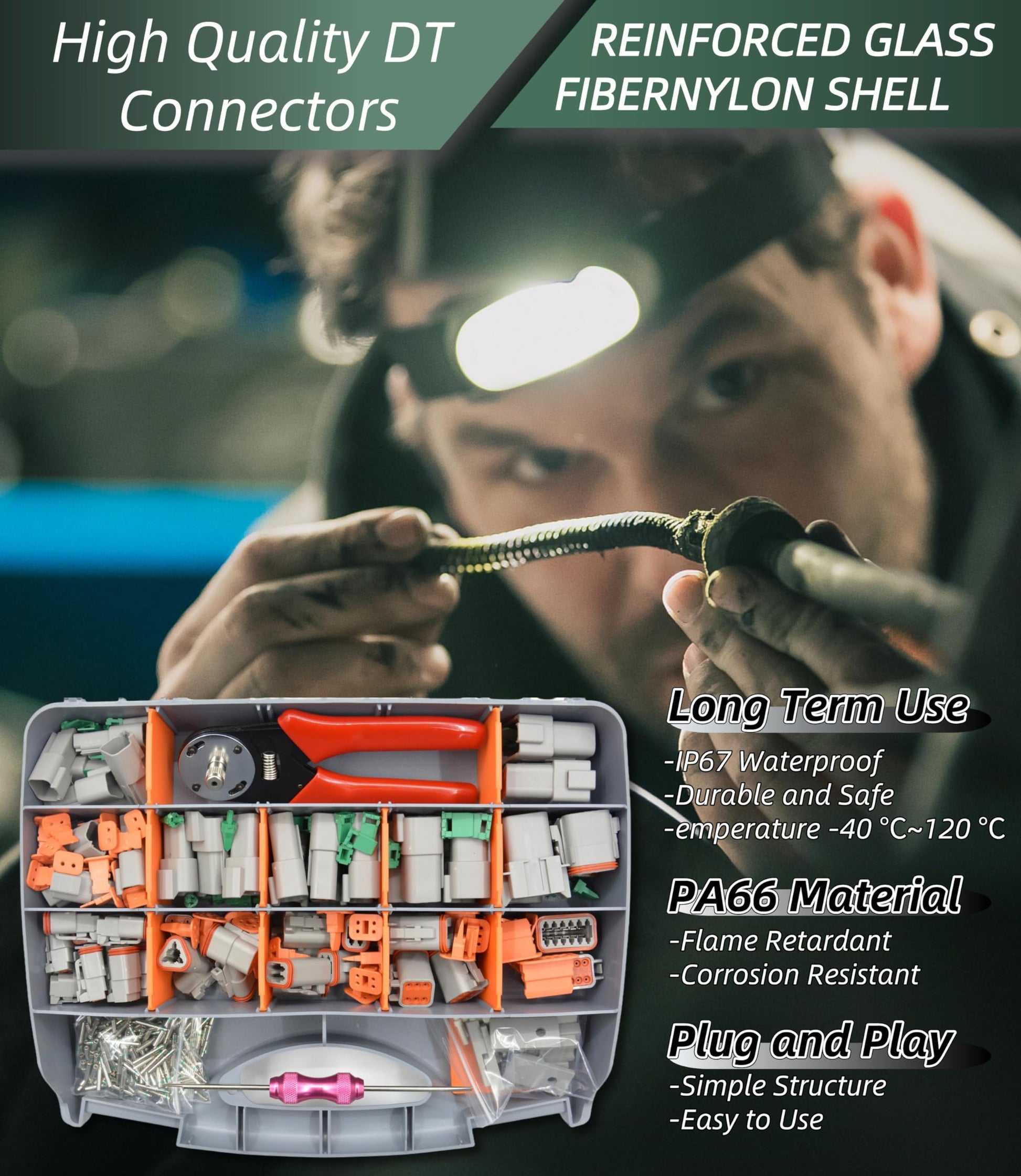 - Deutsch Connector Kit: Includes all components to assemble DT electrical connector plugs as well as disassembly and crimping tools. All DT connectors are made of flame-retardant nylon (PA66+30% GF), water and dust resistant, strong quality and safe installation. The stronger snap-on design ensures that the contacts are inserted accurately and completely into the housing, preventing them from slipping out of the connector. It can also be easily removed for plug-and-play when needed