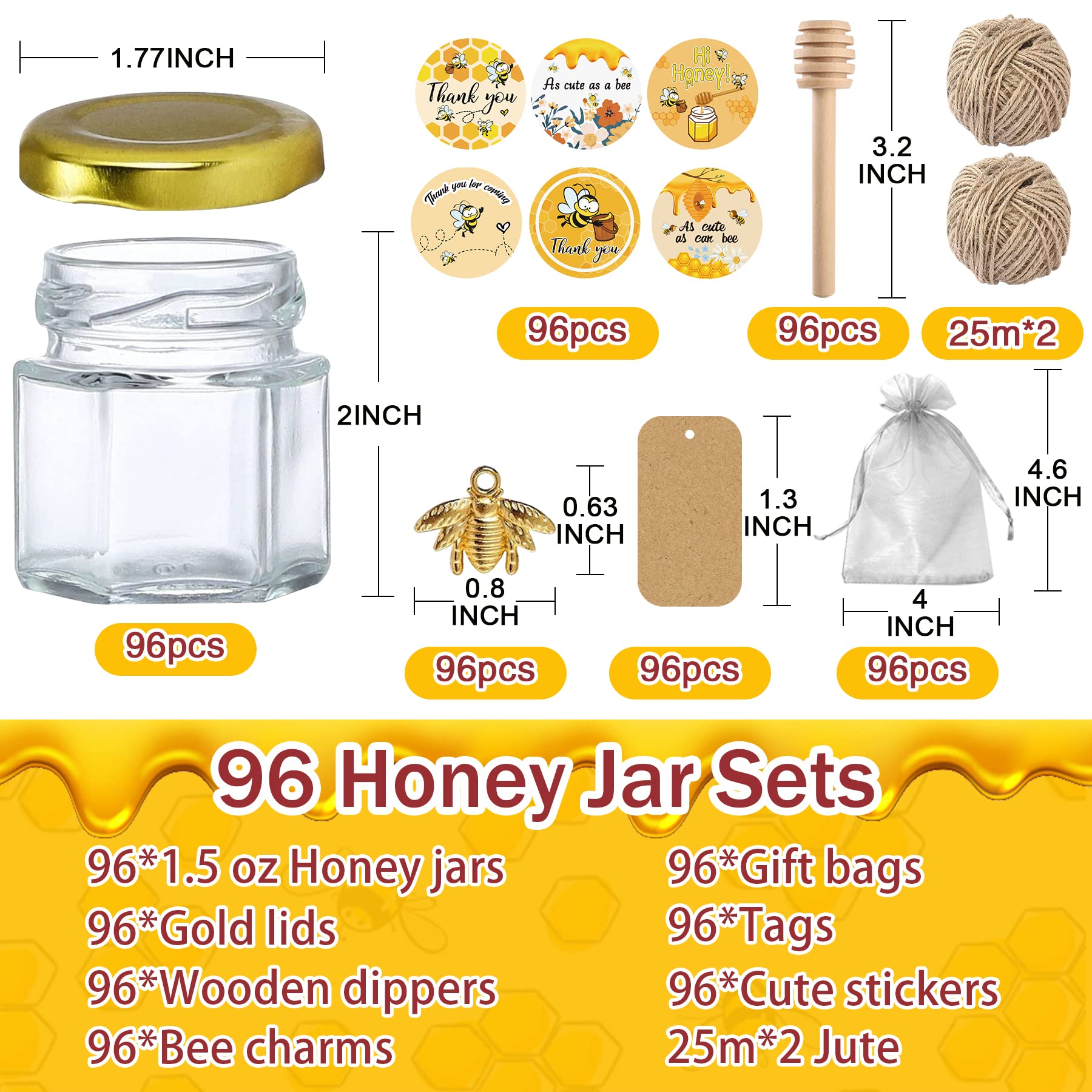 - Great Value Mini Honey Jars Set: This set includes 96 hexagon mini honey jars with dippers, lids, stickers, bee charms, gift bags, tags, and 50m of jute twine. Everything you need to craft thoughtful party favors or sweet handmade gifts with ease.