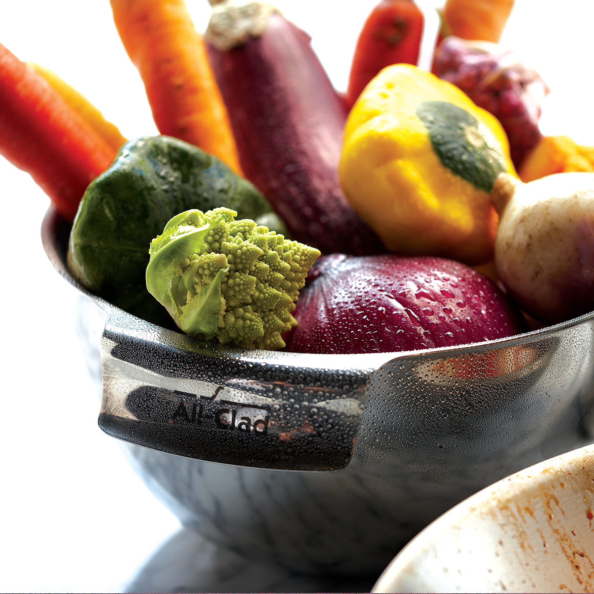 Renowned worldwide for its cookware collections, All-Clad now makes kitchen accessories, and that's welcome news to serious and professional cooks. This set of gorgeous mixing bowls is a perfect example. Made of heavy 18/10 stainless steel polished to a deep, gleaming mirror finish, they're stain- and corrosion-resistant and nonreactive to acidic foods like salad dressings and marinades. Their side handles are generously sized and cleverly angled to provide an exceptionally firm grip when whisking egg whites or whipping cream, and the rolled edges permit pouring without dripping. The set consists of a 5-quart bowl (10 inches in diameter), a 3-quart bowl (8-1/2 inches in diameter), and a 1-1/2-quart bowl (7 inches in diameter) that nest inside one another. The bowls are dishwasher-safe and carry a lifetime warranty against defects. --Fred Brack