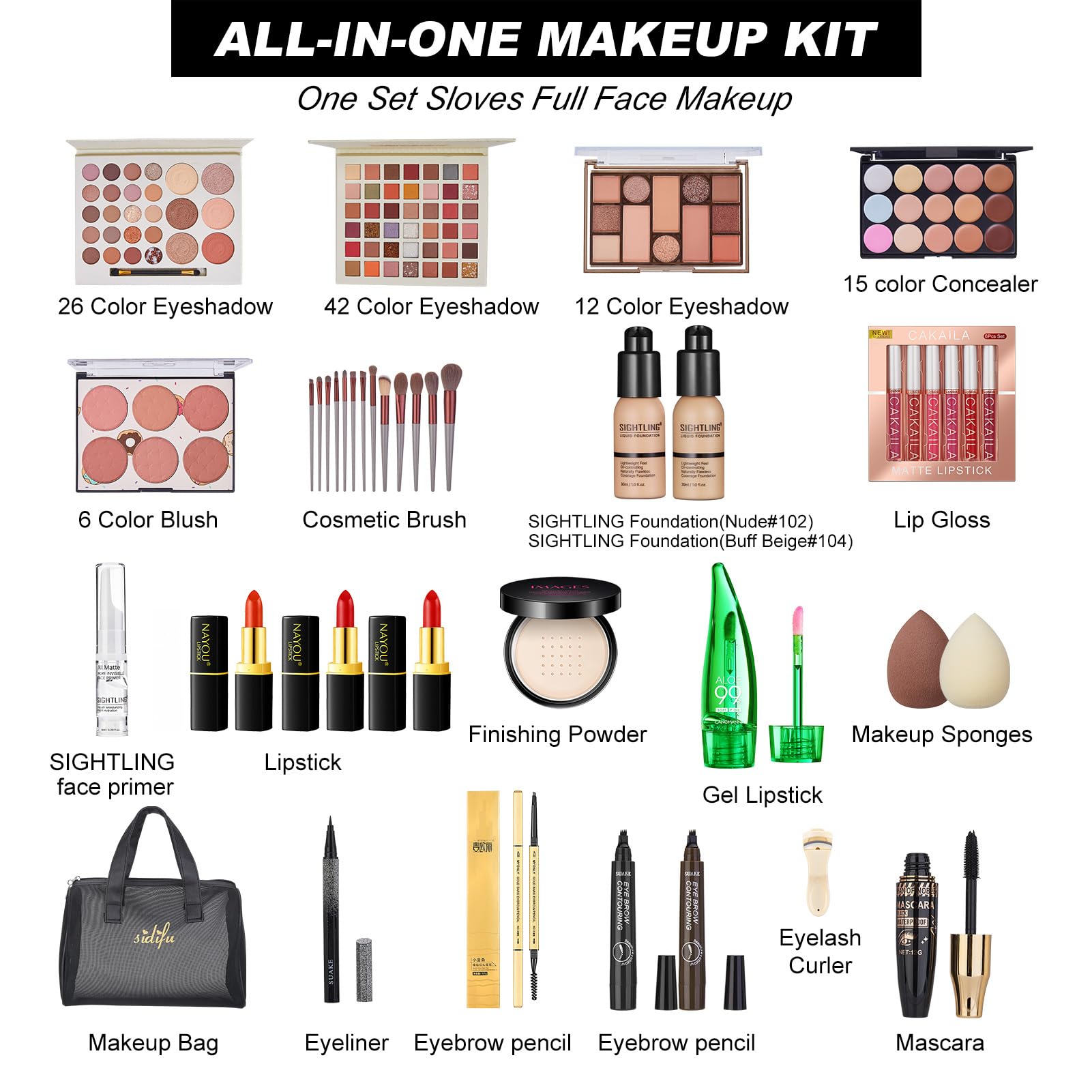 - 【All-in-One Makeup Kit】This all-in-one Christmas makeup Gift Set including eyeshadow palette, face foundation makeup, concealer, powder puff, lipstick, eyeliner, eyebrow pencil, eyelash Curler, Marscara, cosmetic brush and travel bag. It's the perfect all-in-one makeup solution for your daily needs, making it easy for a girl or women.