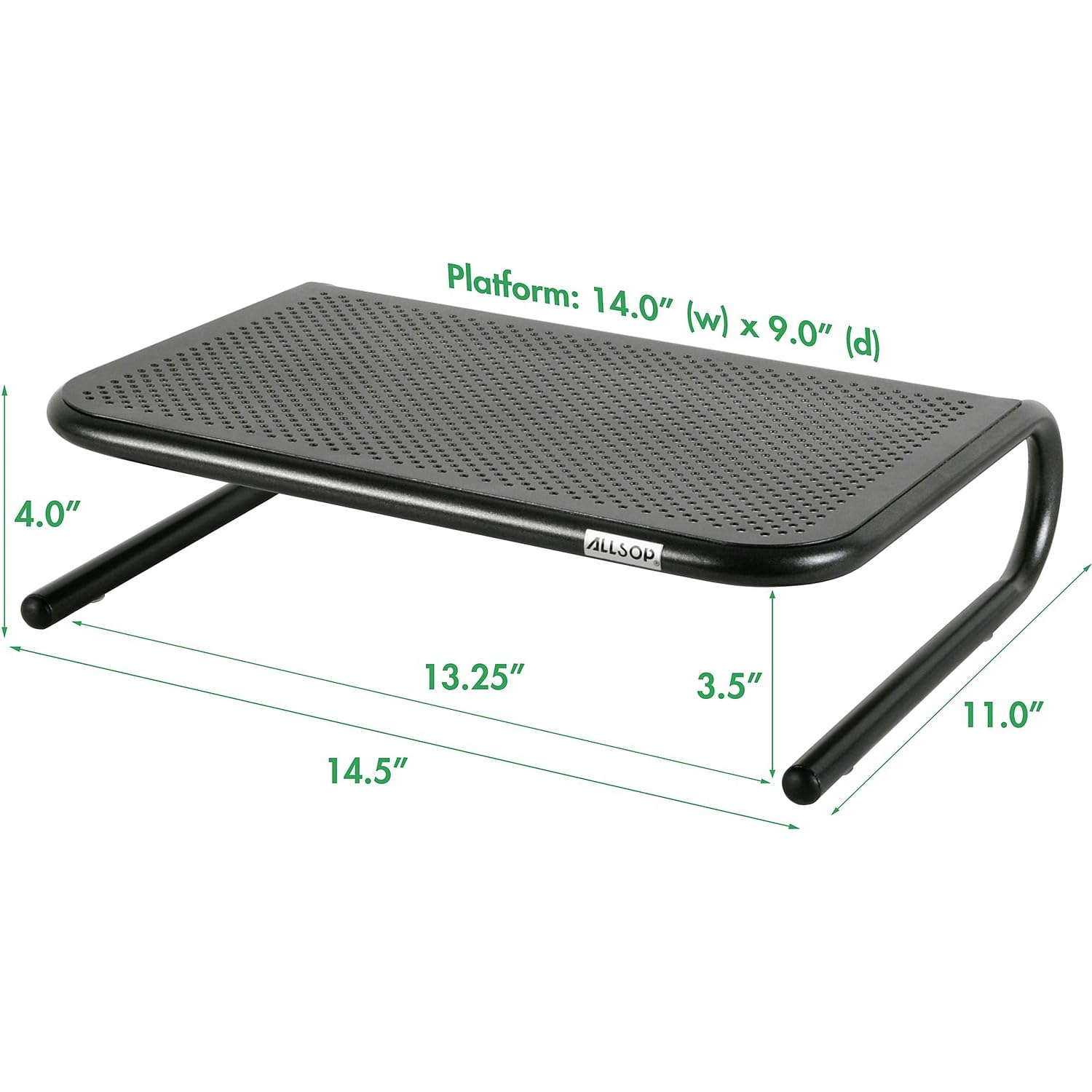 Details: The metal art Jr Laptop/monitor stand features a clean and timeless design that raises your Laptop or monitor to a comfortable and ergonomically correct viewing height. Forged from steel and powder coated, it provides a sturdy shelf for your Laptop, monitor, TV or printer. Additionally, there's space beneath for your keyboard or other office supplies and electronics. The Allsop metal art curved steel monitor stand was designed in the USA by engineers in Bellingham, WA and was the first and original curved metal monitor stand to be introduced and sold in North America. The Allsop metal art series of products continues to be of the highest quality and popularity with over one million units sold.