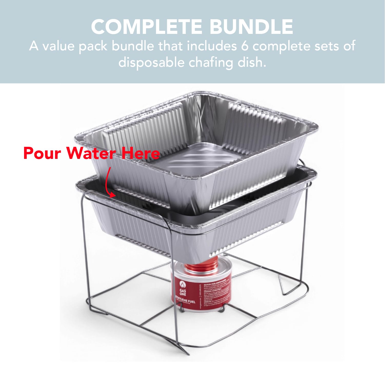 - Complete Chafing Dish Set: Our chafers and buffet warmers sets include all the tools and accessories for a perfect buffet setup! This set includes 6 x chafing dish wire rack, 3 x sets of utensils, 6 x aluminum half size pans, and 6 x cans of high-quality fuel for chafing dish that can last hours!