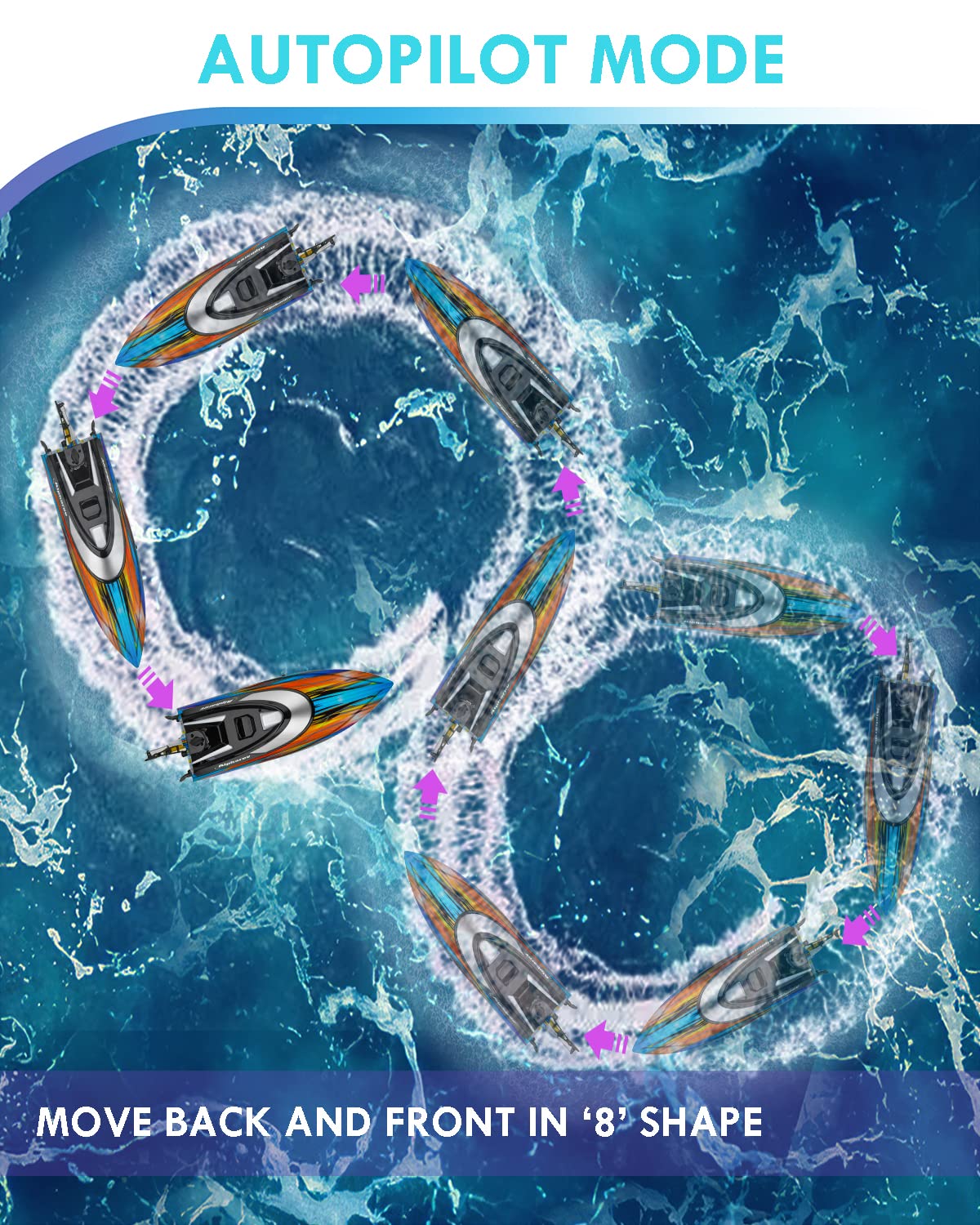 - LED Lights and Autopilot Mode: Led lights allow you identify the position and direction of the boat in the Pools and Lakes at night.Press the autopilot mode button, the hull will automatically move back and forth in the "8" shape, bring more fun to children